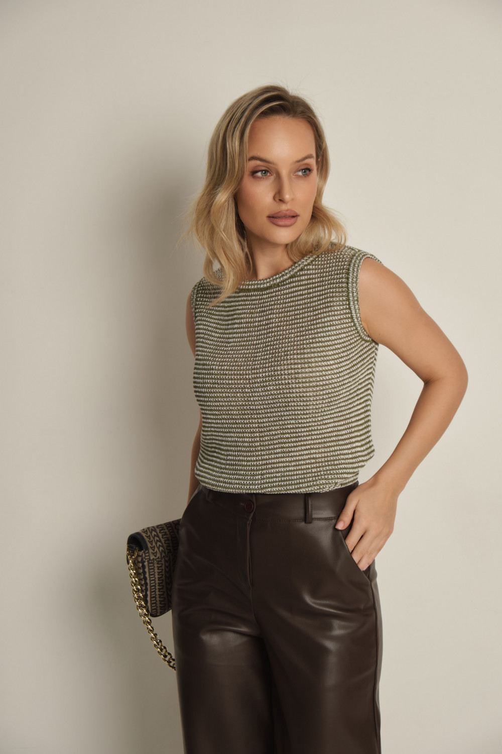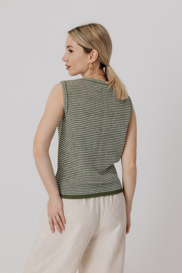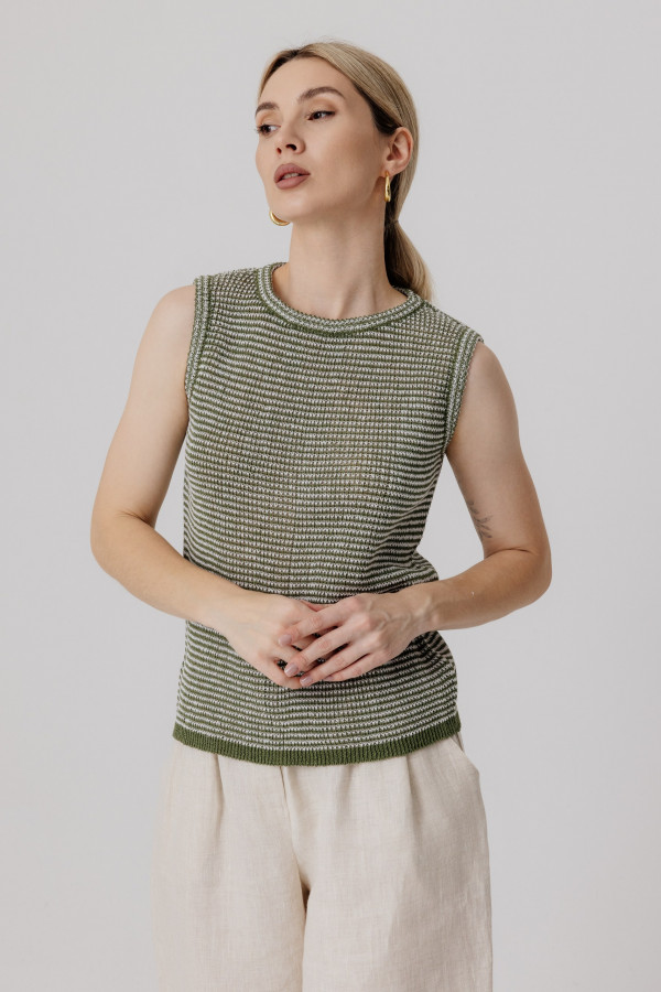 Женский топ 100% лен, силуэт приталенный, без рукавов с круглым вырезом. Принт в полоску, имеет лаконичный и универсальный дизайн. Подходит для повседневного образа, хорошо сочетается с брюками, юбками.