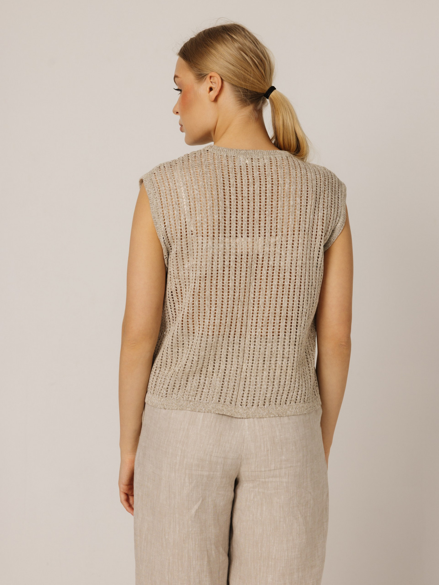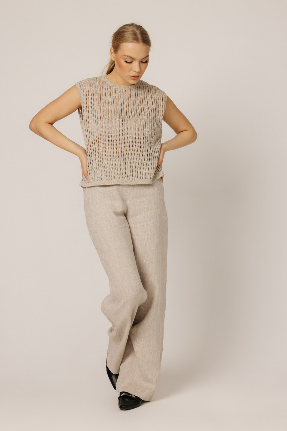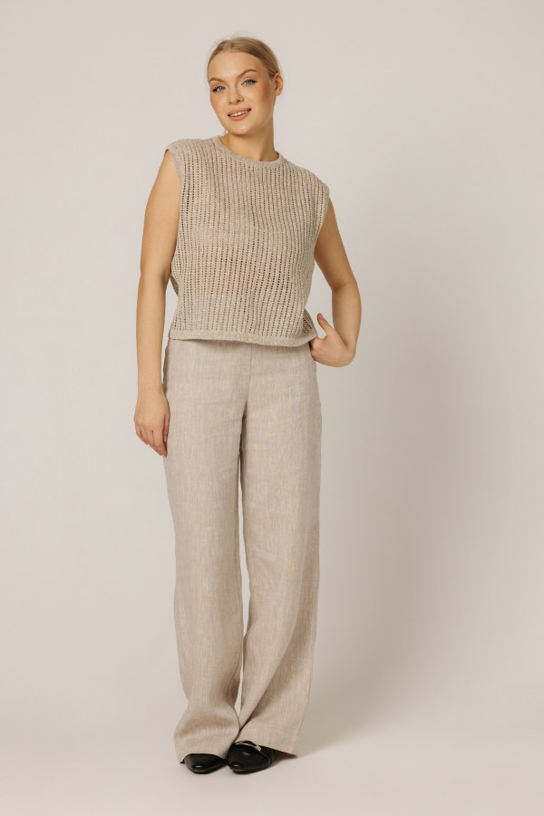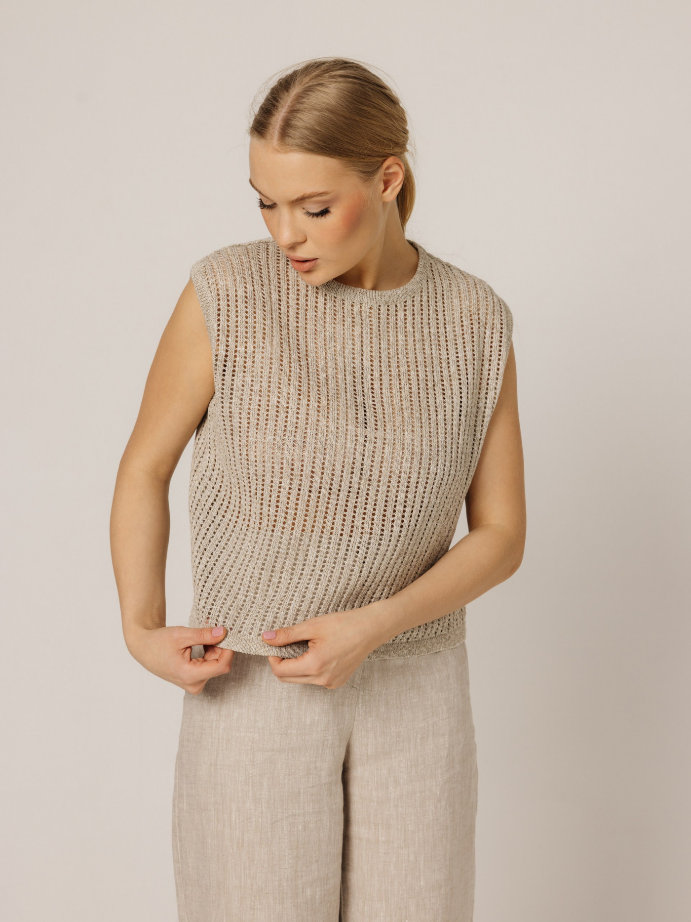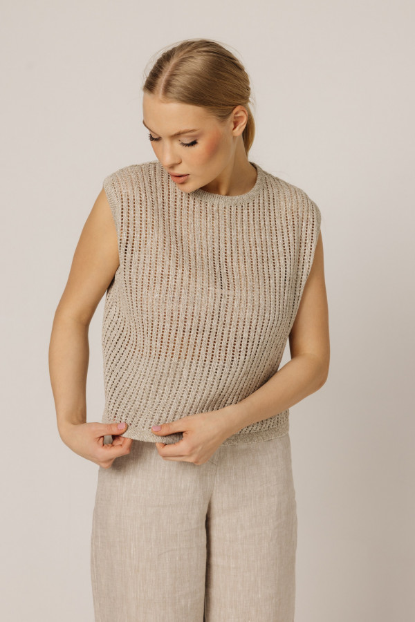 Женский топ 100% лен, силуэт приталенный, без рукавов с круглым вырезом. Выполнен в серо-белую полоску, имеет лаконичный и универсальный дизайн. Подходит для повседневного образа, хорошо сочетается с брюками,юбками.