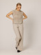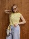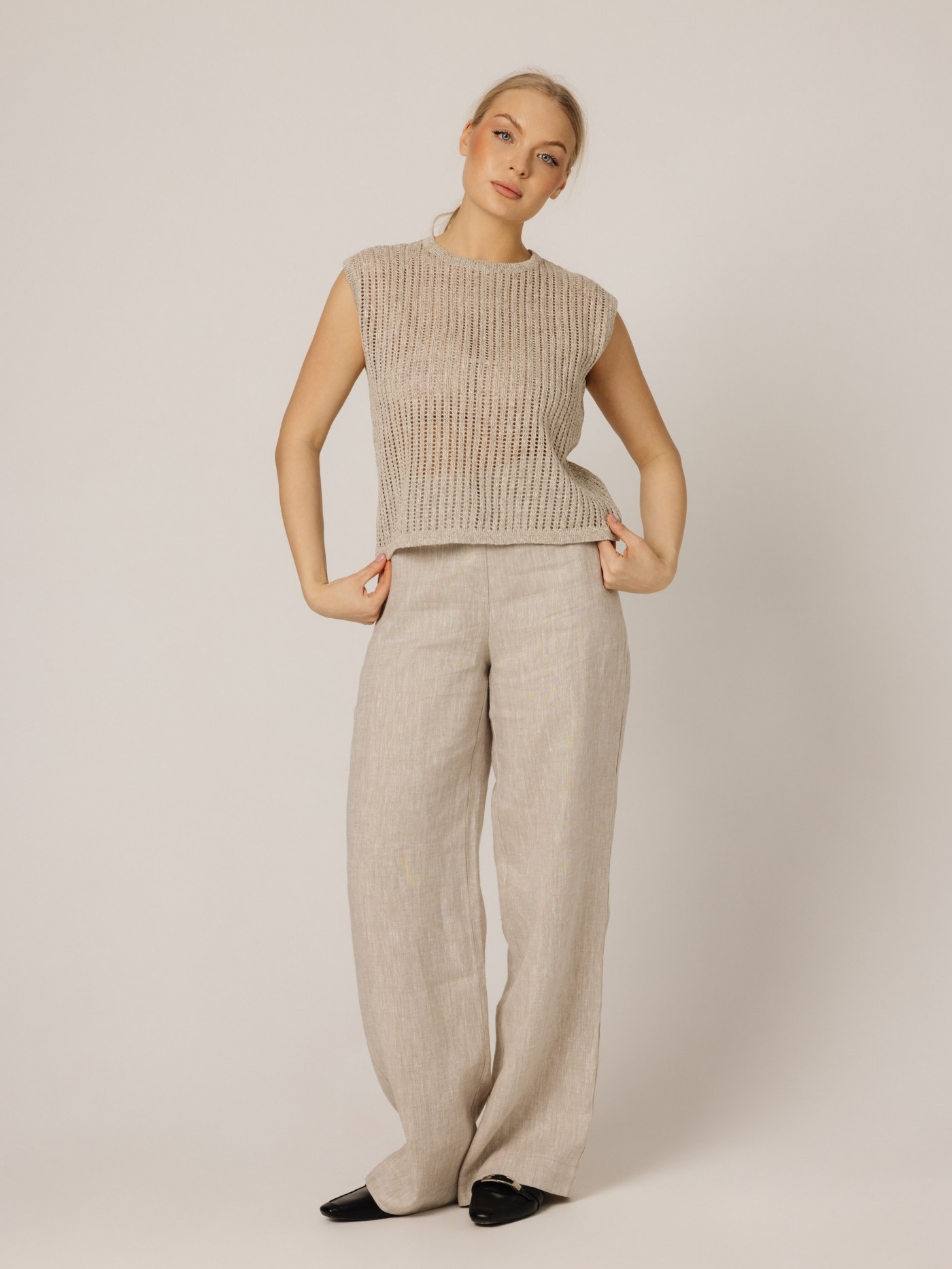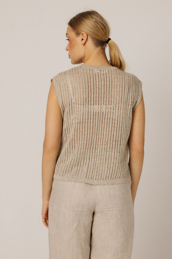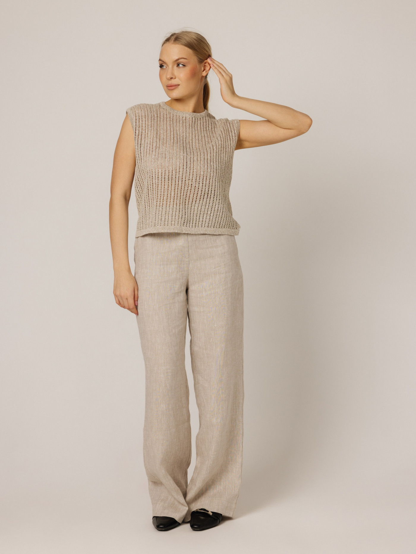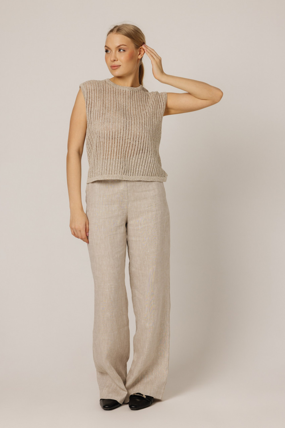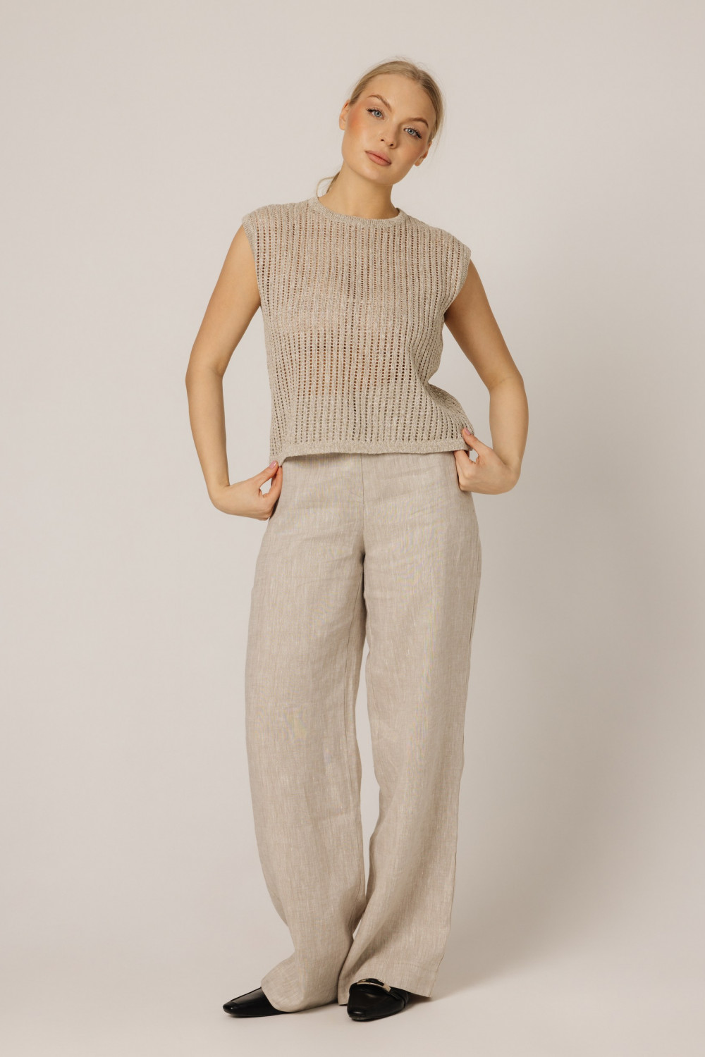 Женский топ 100% лен, силуэт приталенный, без рукавов с круглым вырезом. Выполнен в серо-белую полоску, имеет лаконичный и универсальный дизайн. Подходит для повседневного образа, хорошо сочетается с брюками,юбками.