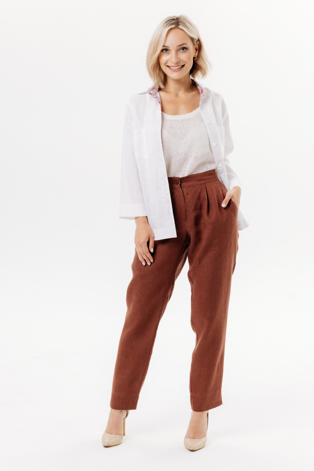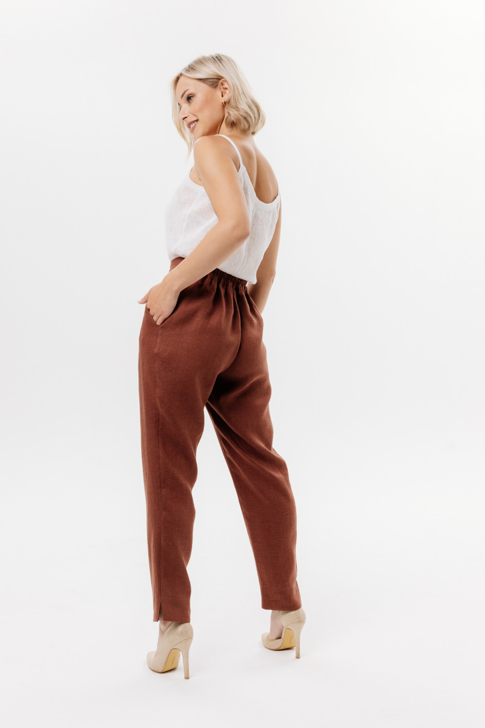 ​Слаксы из льняной ткани. На передней половинке брюк карманы подрезные. Пояс на резинке. Отделка внутренняя на поясе, кармане и по низу брюк.