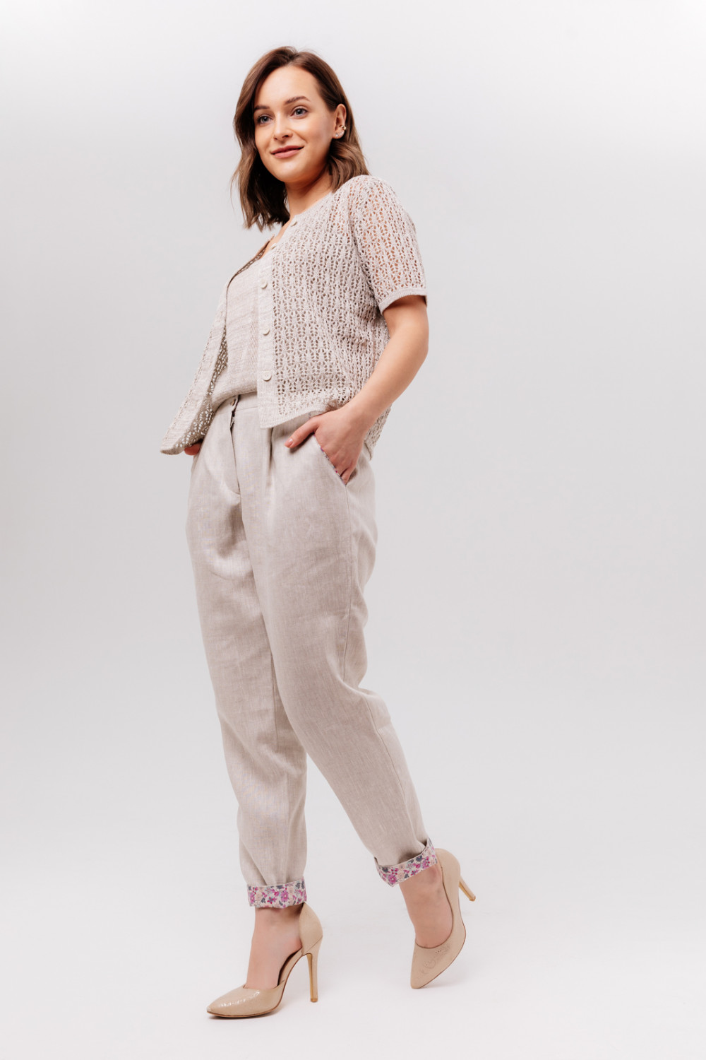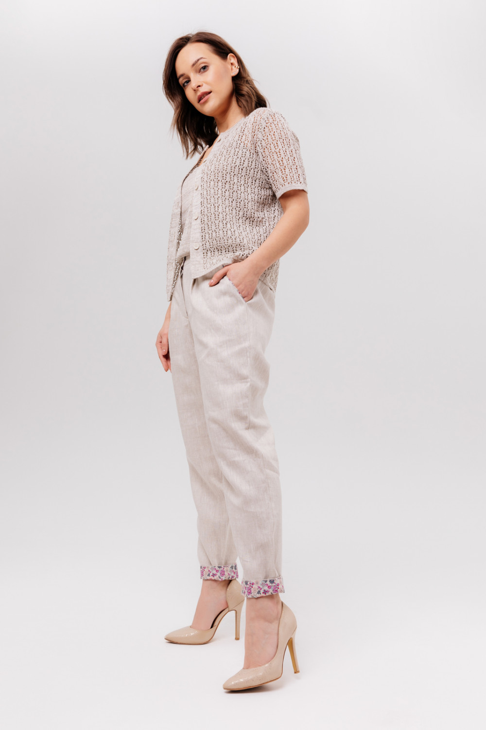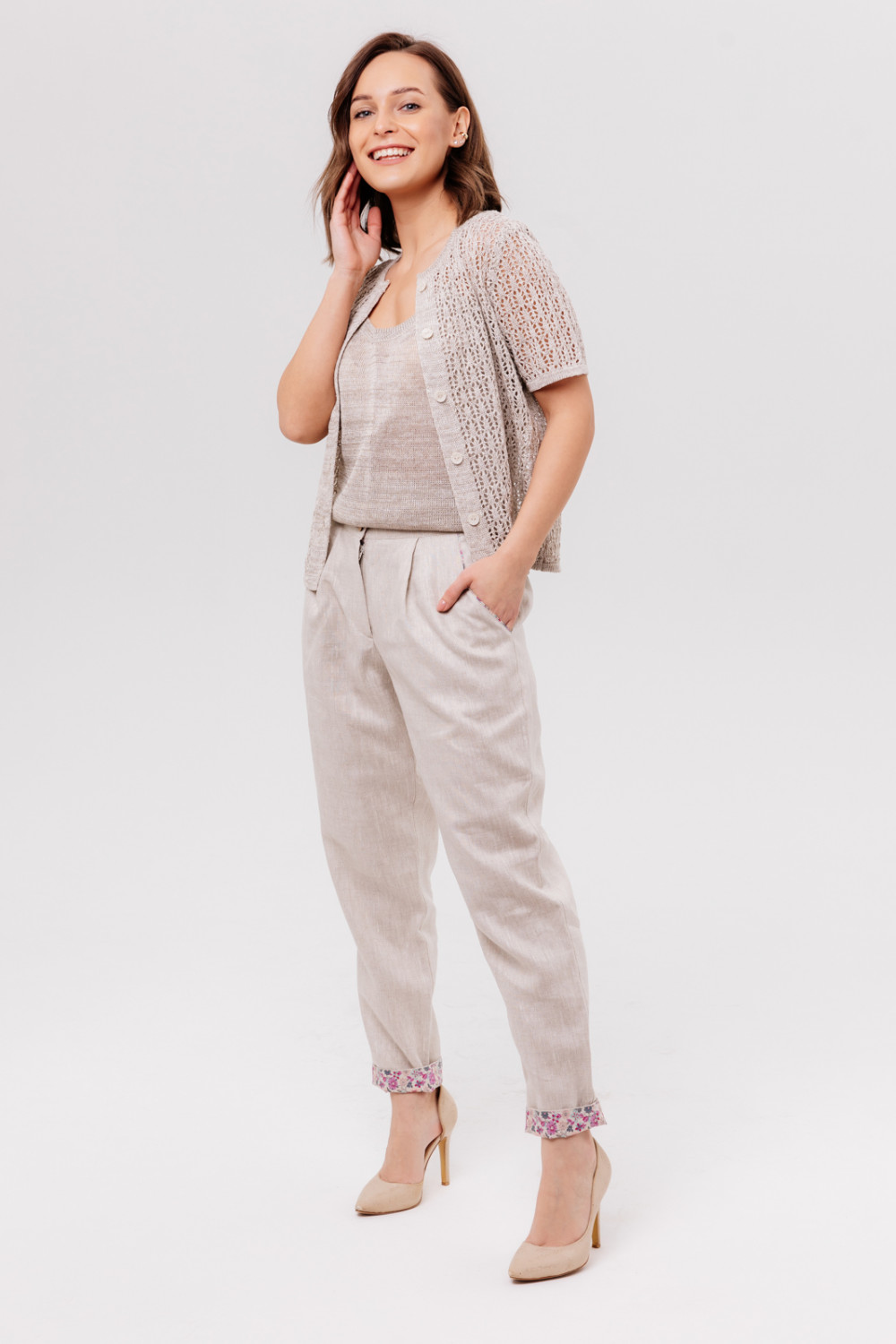 Слаксы из льняной ткани. На передней половинке брюк карманы подрезные. Пояс на резинке. Отделка внутренняя на поясе, кармане и по низу брюк. Отделка 100% хлопок.