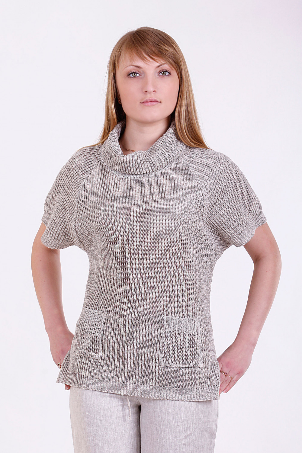 Джемпер из льна, силуэт прямой, рукав реглан, воротник хомут, 2 накладных кармана.