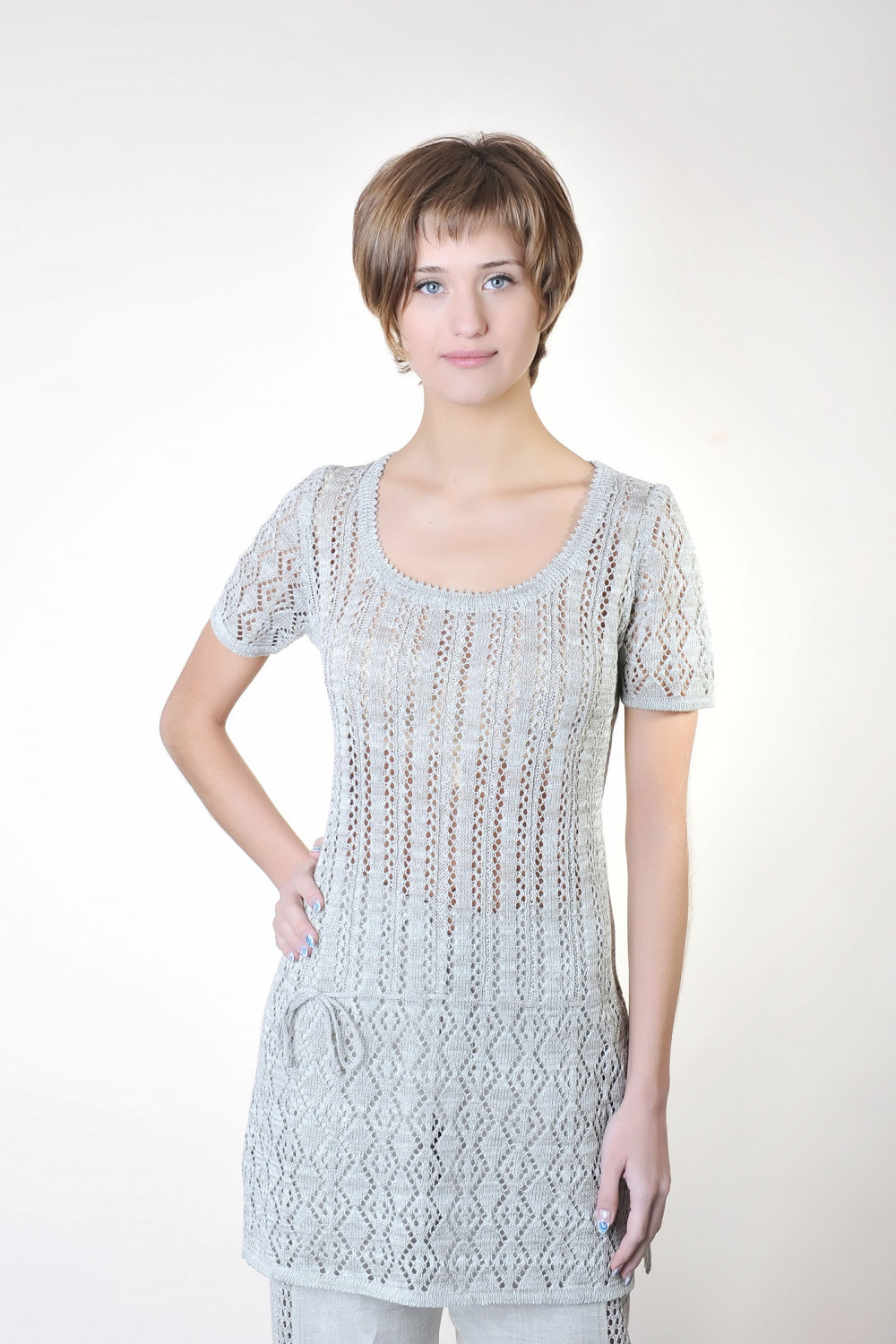 Джемпер из льна ажурный, силуэт прямой удлиненный. Рукав короткий. Горловина круглая.