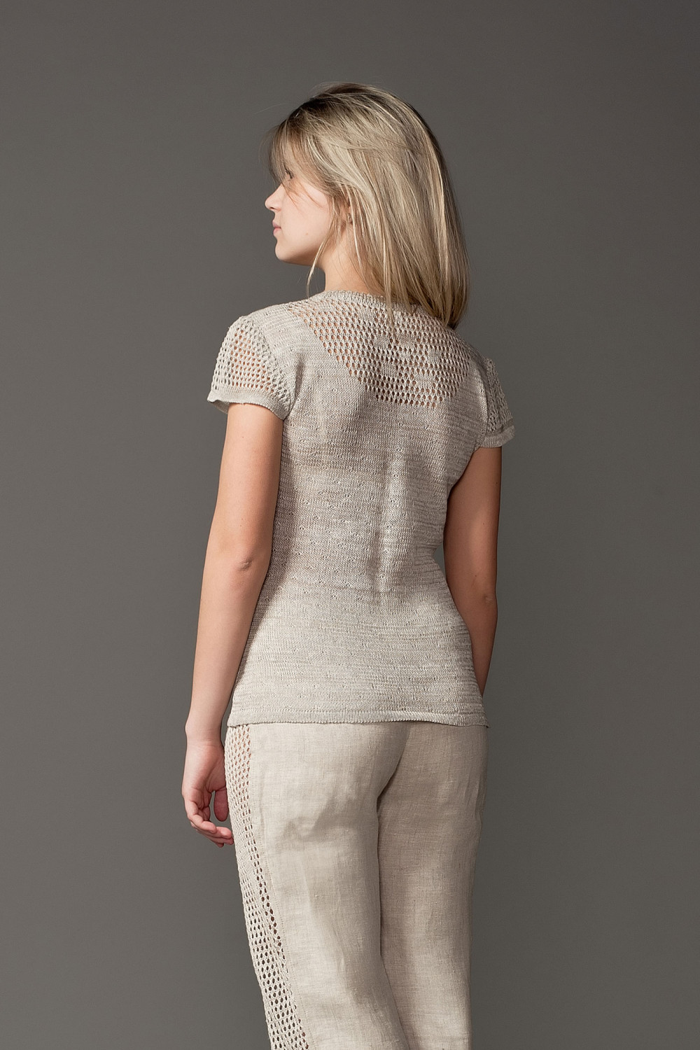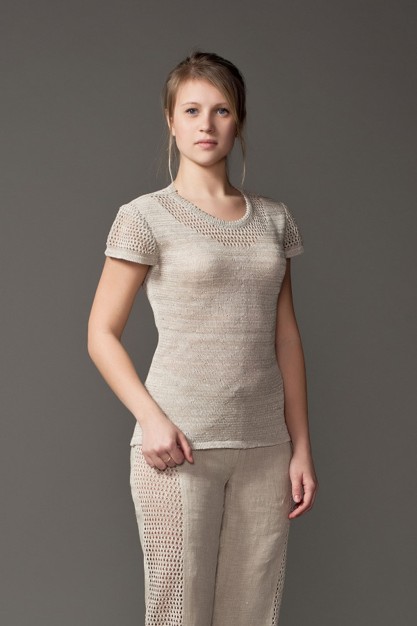 Джемпер 100% лен, силуэт приталенный, по переду и спине отделка ажуром, рукав крылышком, горловина круглая.