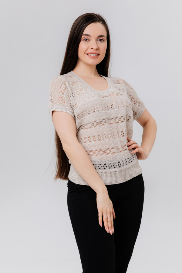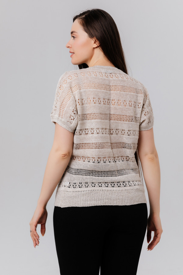 Рукав спущенный, присборенный резинкой, ажур чередуется через кулирку.