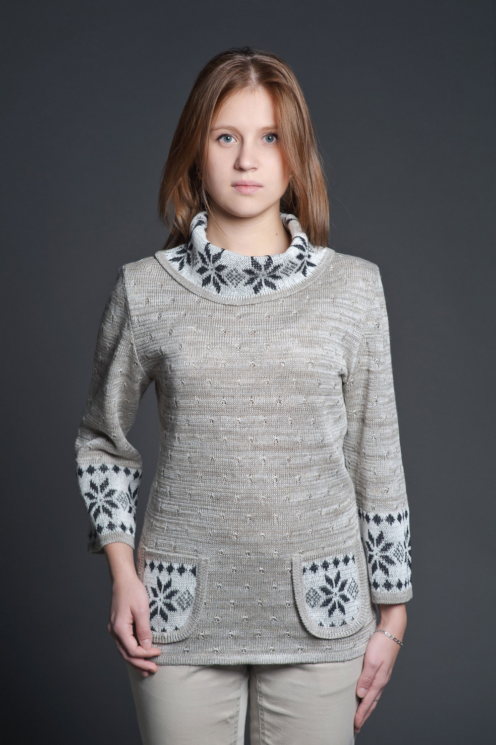 Джемпер женский лен 100%, силуэт приталенный. Воротник двойная стойка, жаккард. Рукав 3/4, по низу жаккард. На полочке 2 кармана.