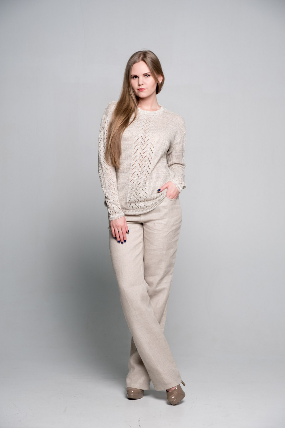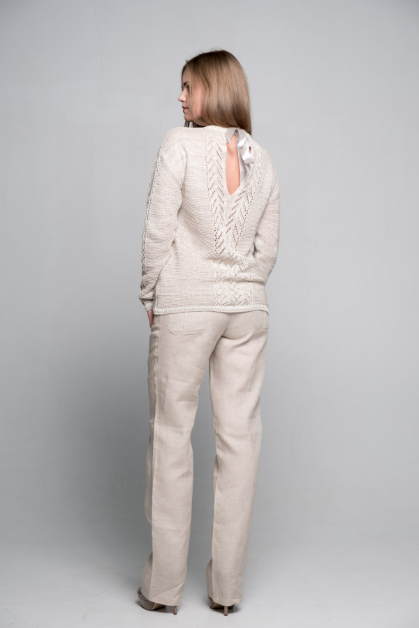 Джемпер100% лен, силуэт прямой, плечо приспущенное. Рукав длинный. Горловина круглая. На спинке по горловине завязывается декаратиная атластная лента.