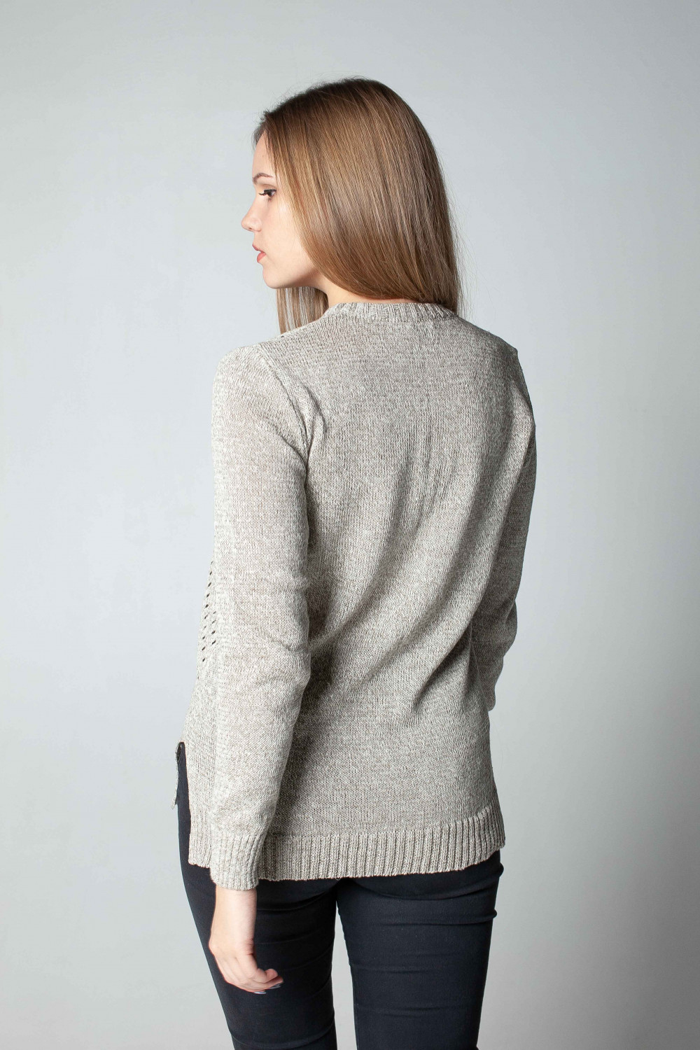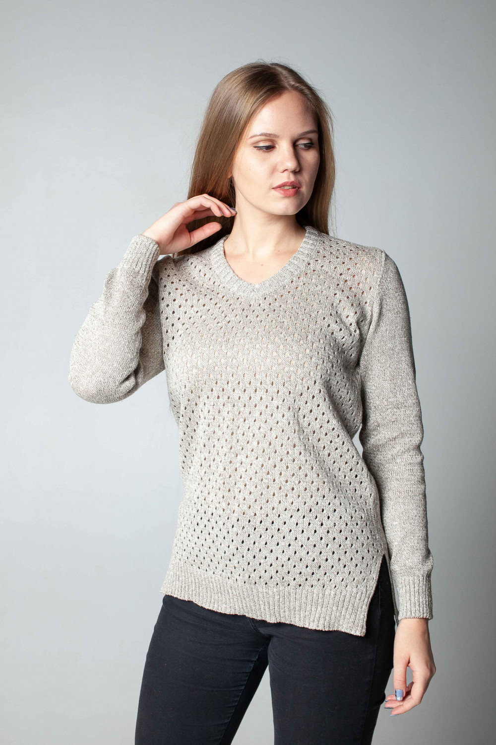 Джемпер из 100% льна, силуэт прямой. Рукав длинный втачной, по низу резинка, по бокам разрезы. Полочка ажурная, спинка гладкая. Вырез на мыс.
