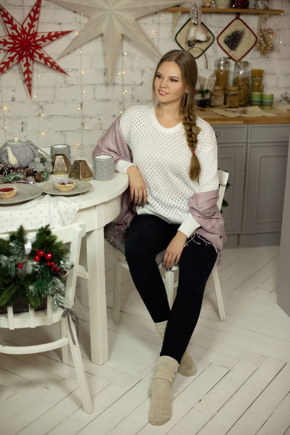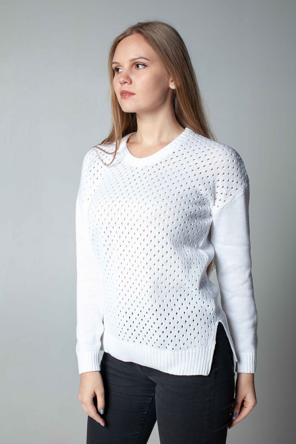 Джемпер из 100% хлопок, силуэт прямой. Рукав длинный приспущенный , по низу резинка, по бокам разрезы. Полочка и спинка ажурная. Вырез на мыс.