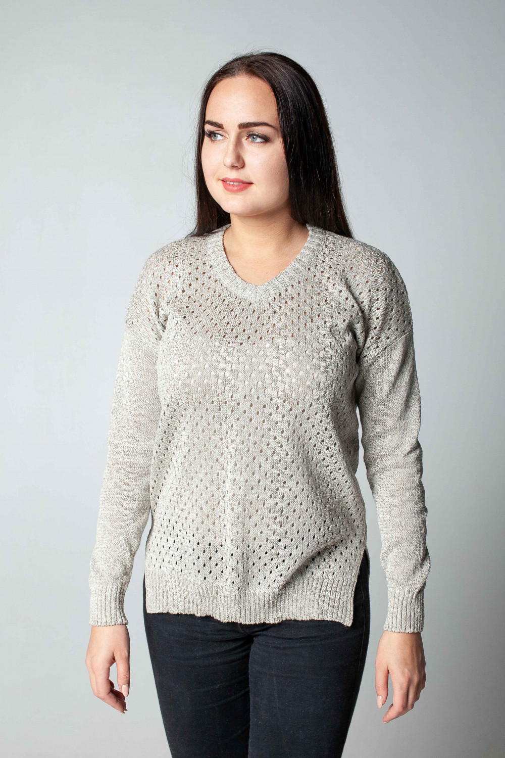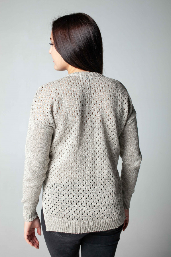 Джемпер из 100% льна, силуэт прямой. Рукав длинный приспущенный, по низу резинка, по бокам разрезы. Полочка и спинка ажурная. Вырез на мыс.