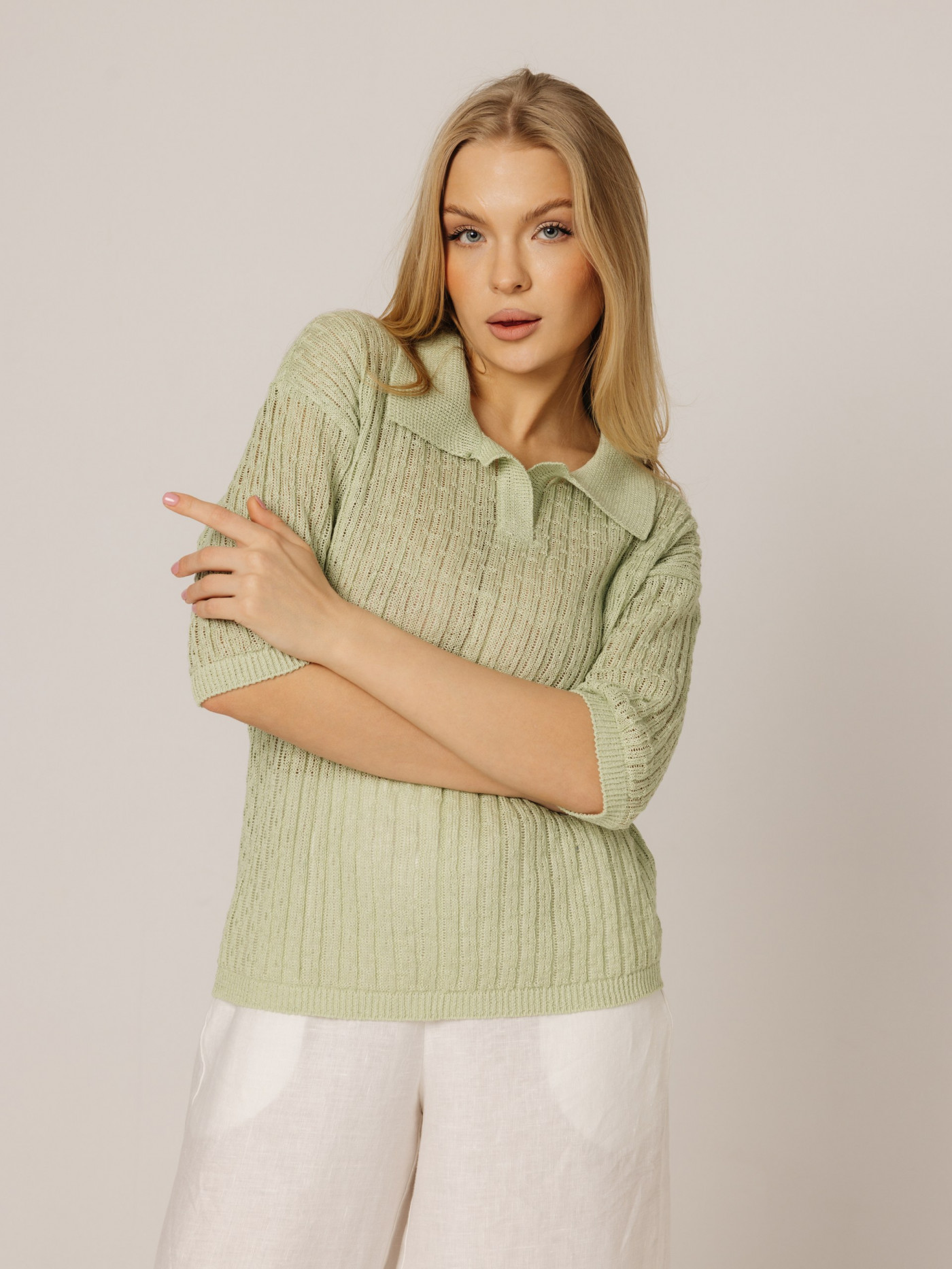 Воротник поло . Плечо приспущенное, рукав укороченный.