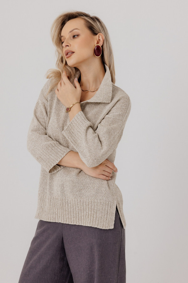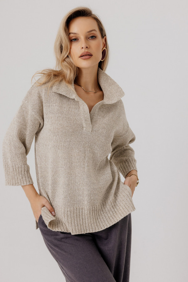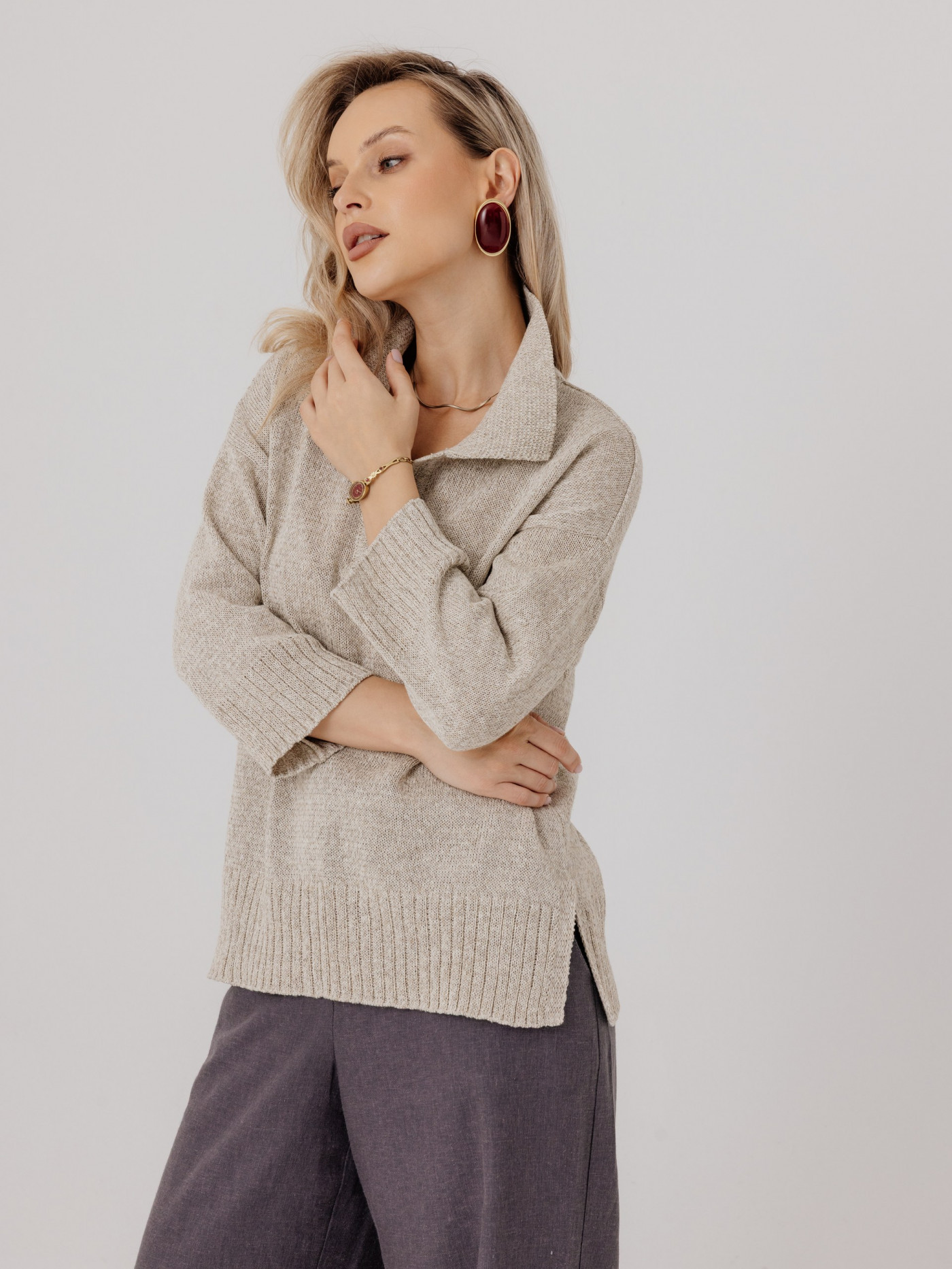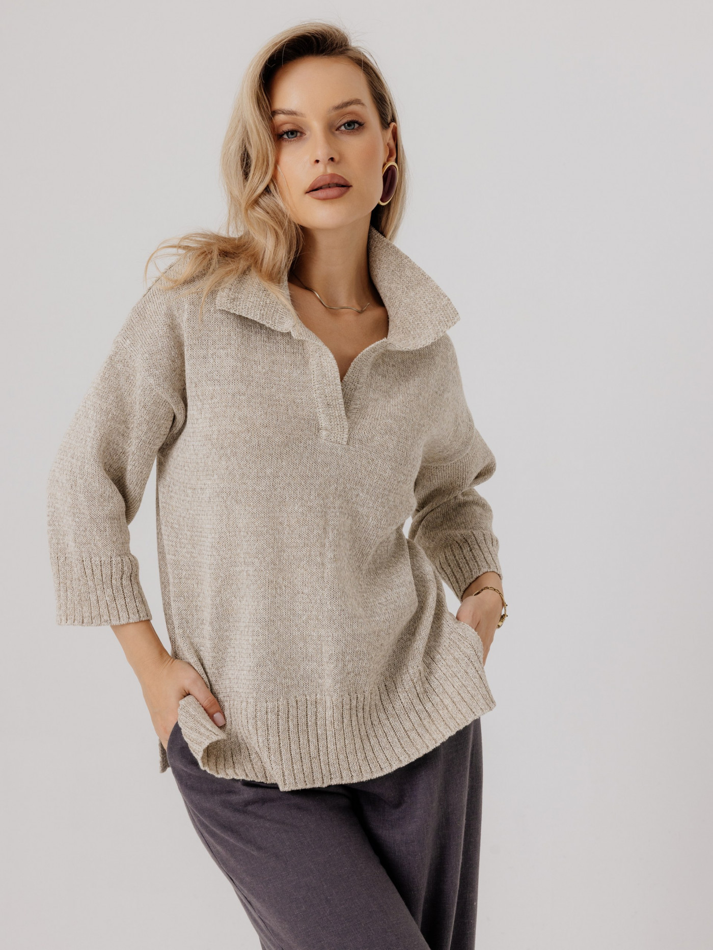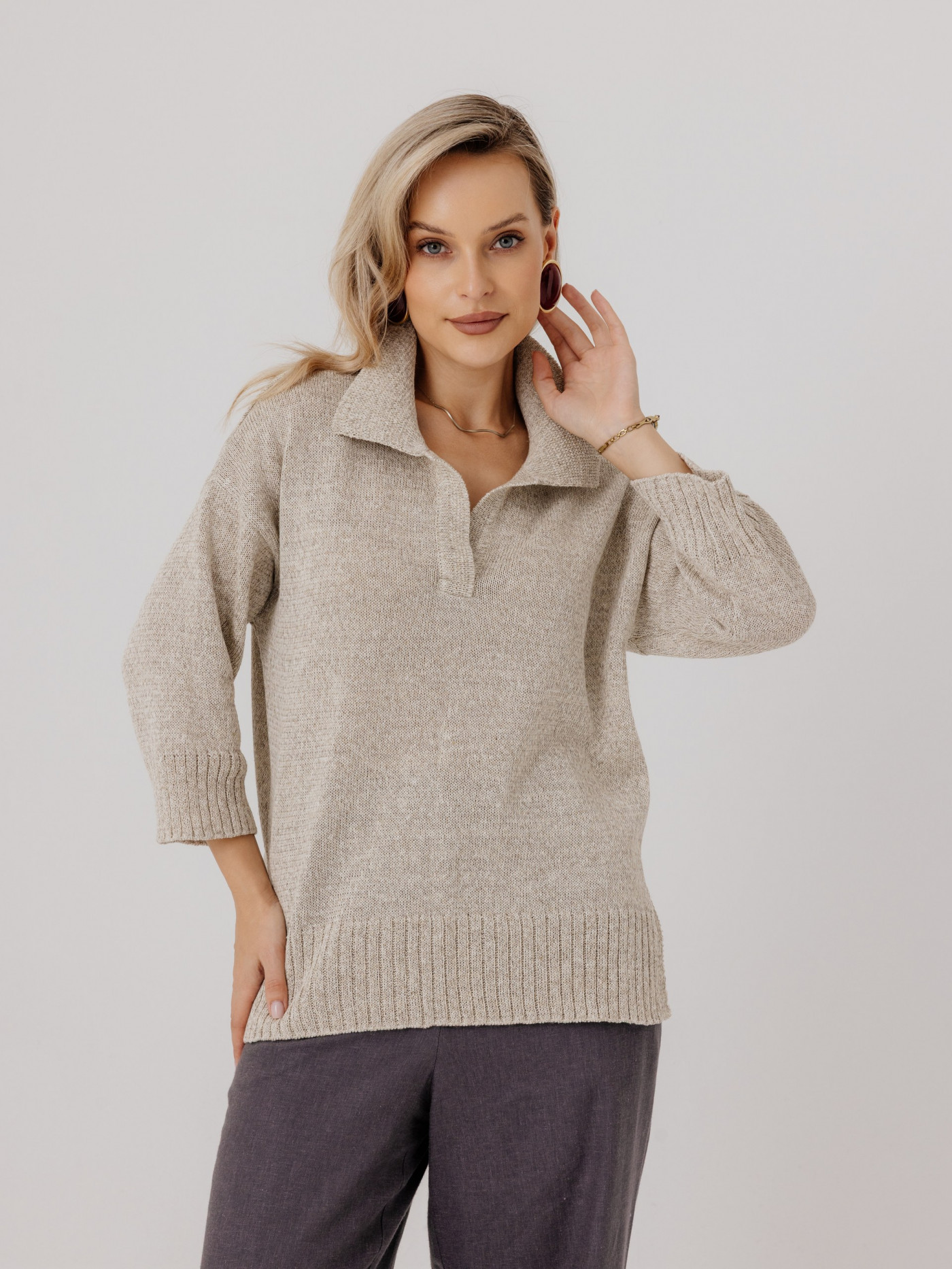 Широкий отложной воротник поло , который добавляет элегантности и делает образ более структурированным. Низ изделия и манжеты выполнены в виде плотной резинки, что обеспечивает аккуратную посадку и подчёркивает текстуру вязки.