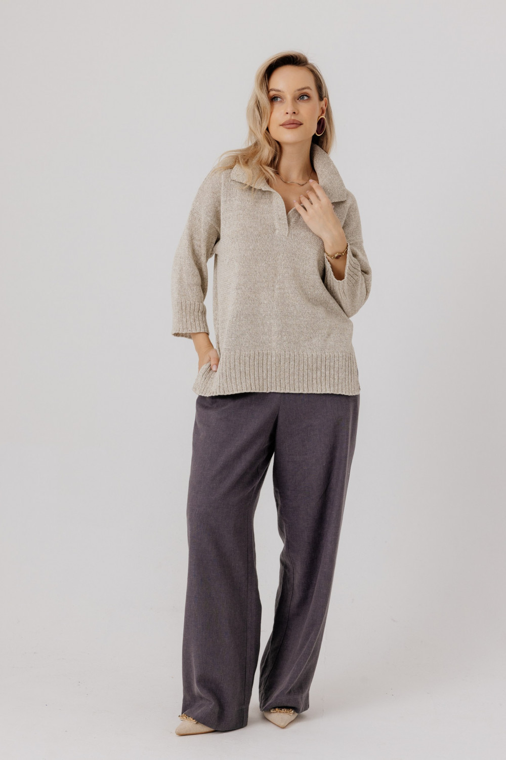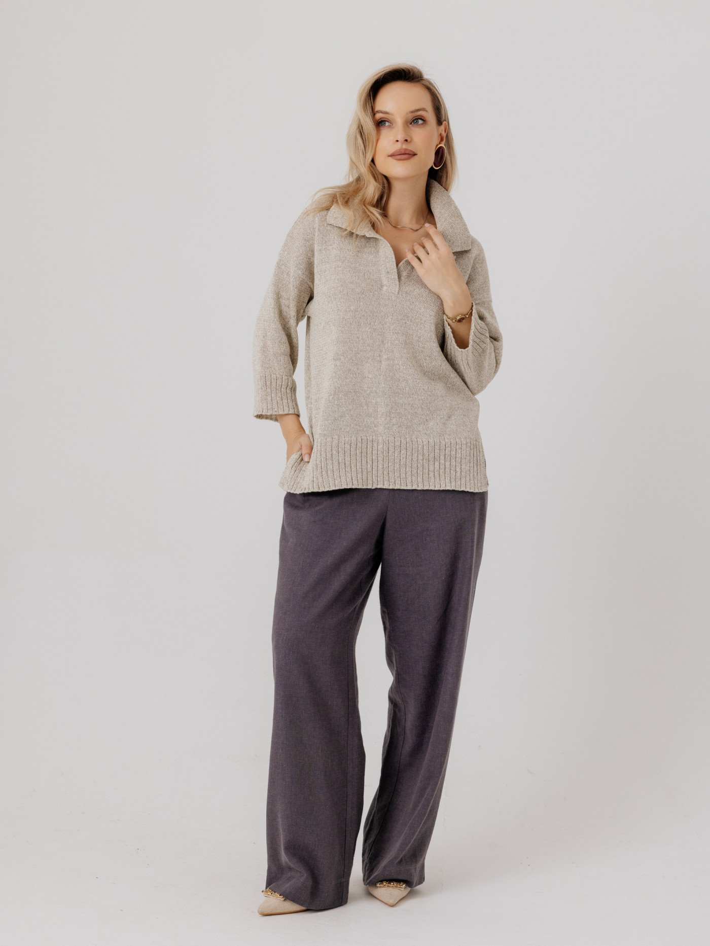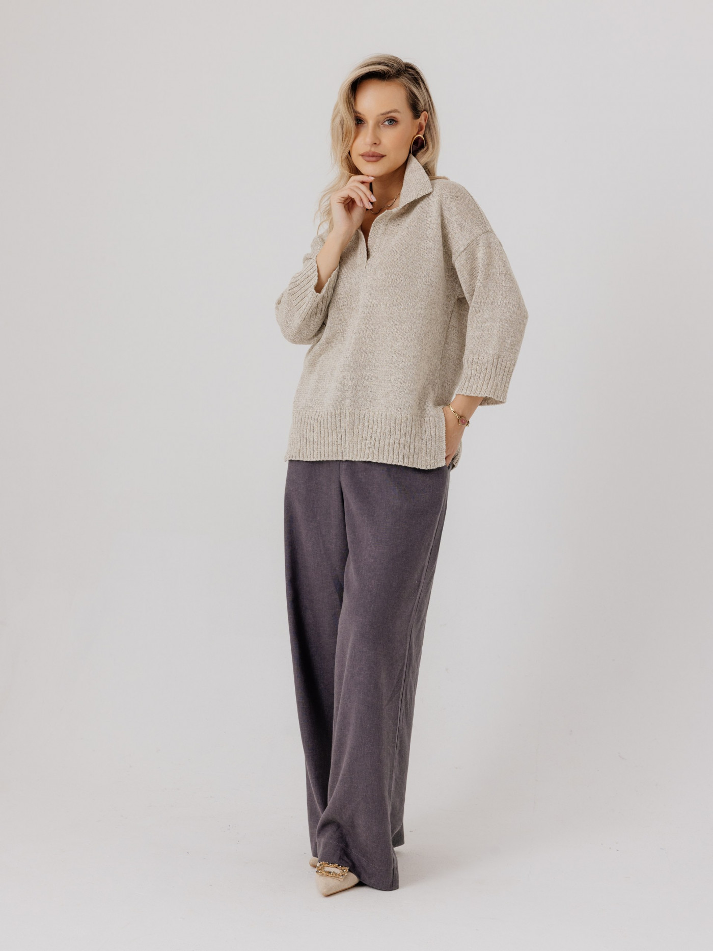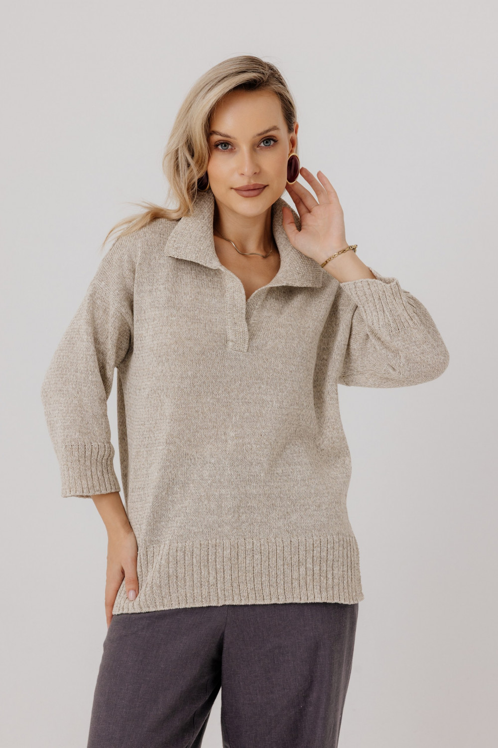 Широкий отложной воротник поло , который добавляет элегантности и делает образ более структурированным. Низ изделия и манжеты выполнены в виде плотной резинки, что обеспечивает аккуратную посадку и подчёркивает текстуру вязки.