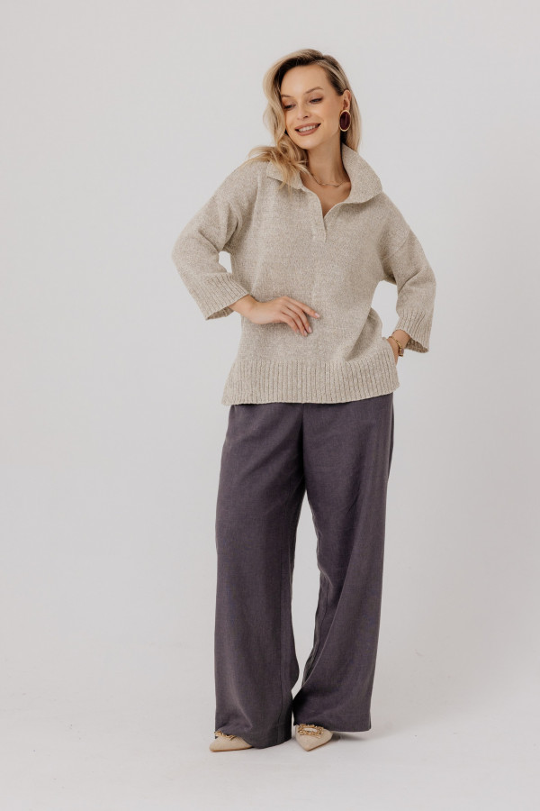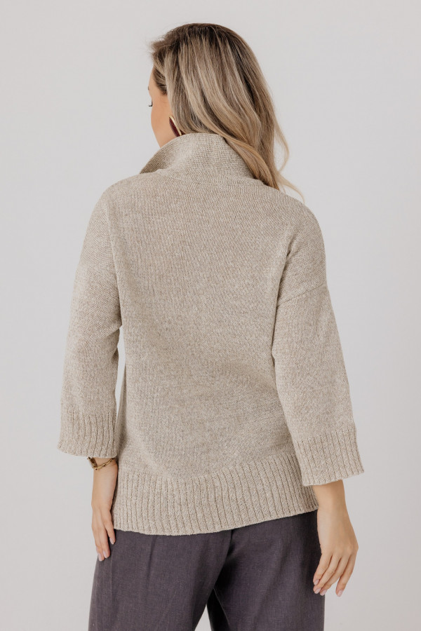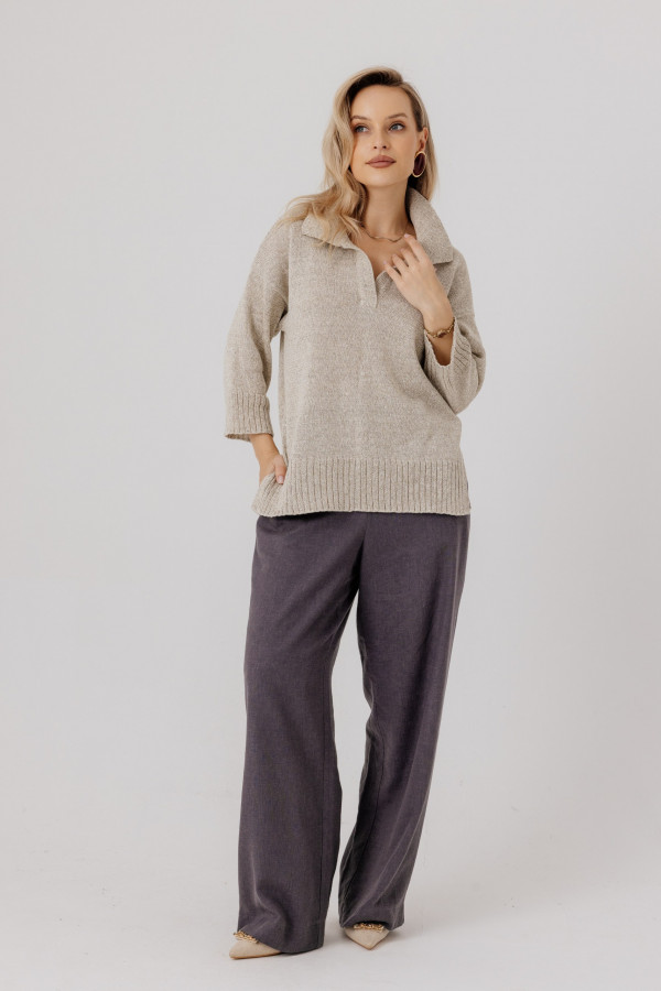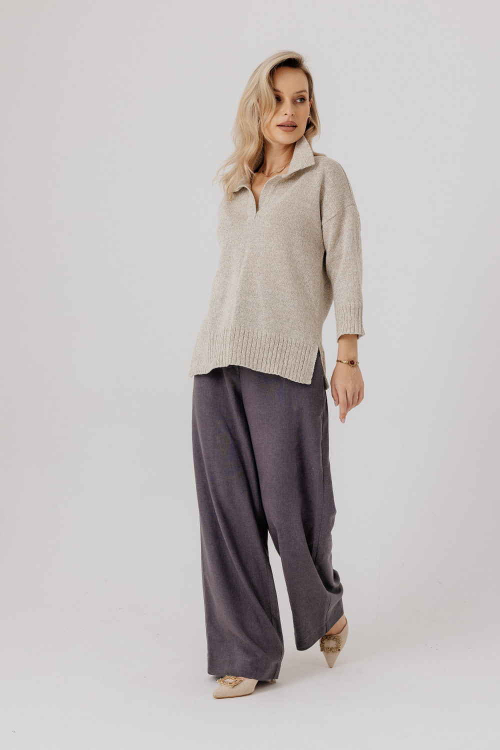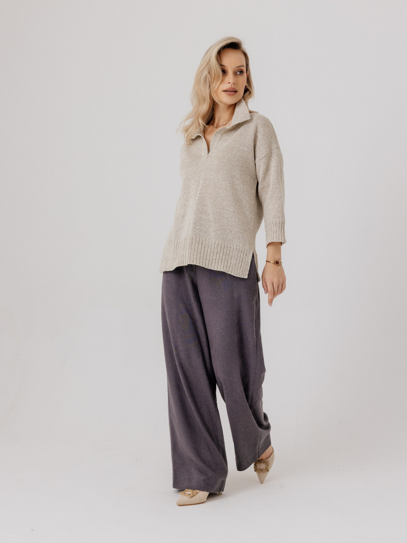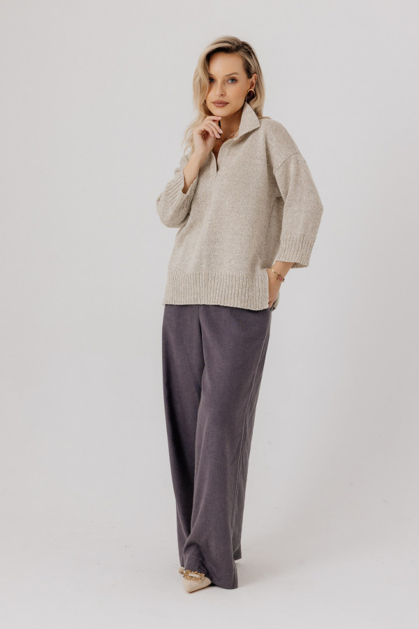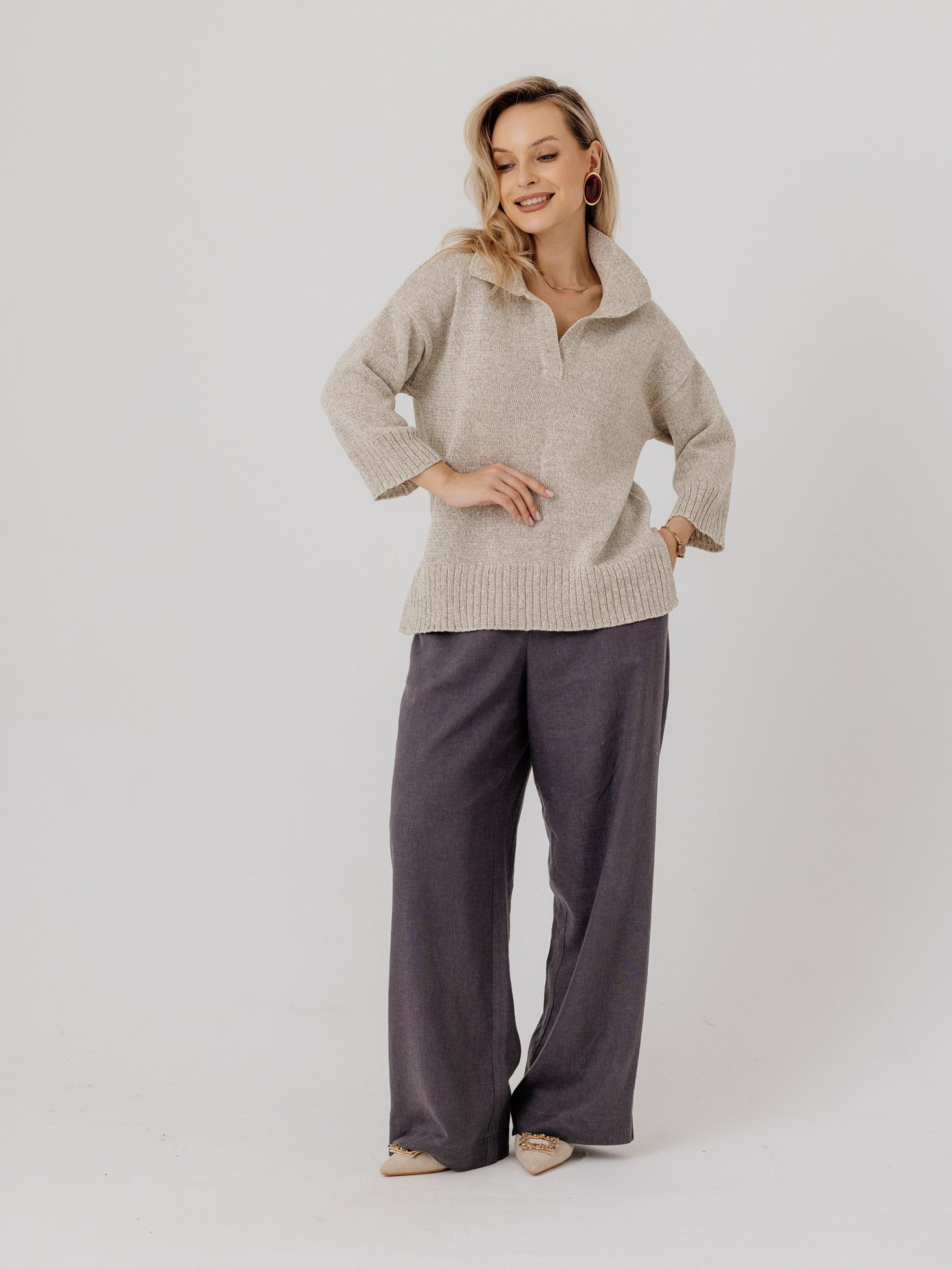 Широкий отложной воротник поло , который добавляет элегантности и делает образ более структурированным. Низ изделия и манжеты выполнены в виде плотной резинки, что обеспечивает аккуратную посадку и подчёркивает текстуру вязки.