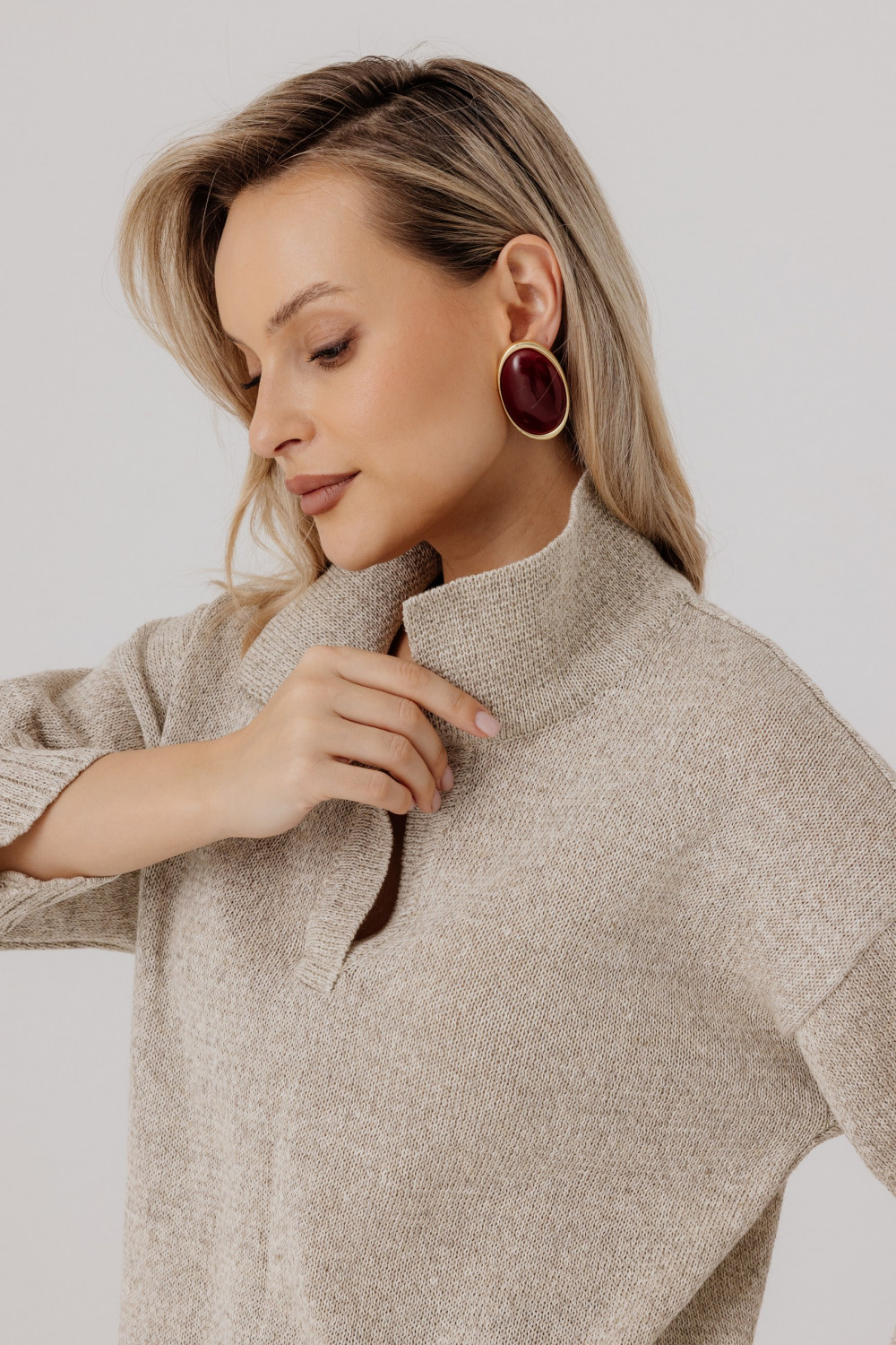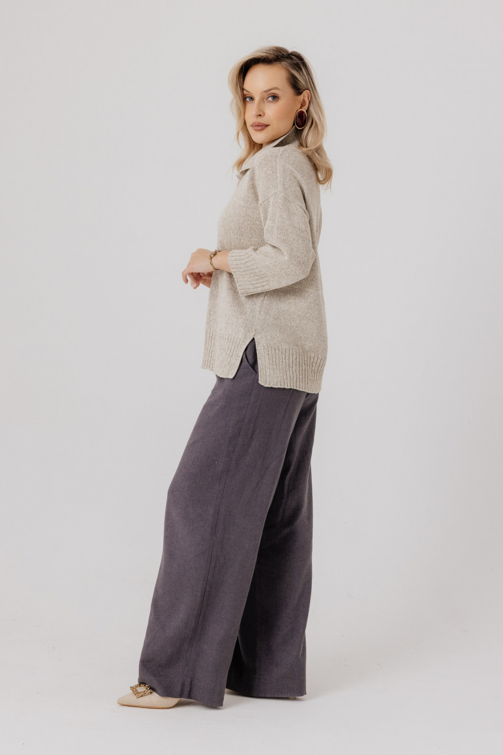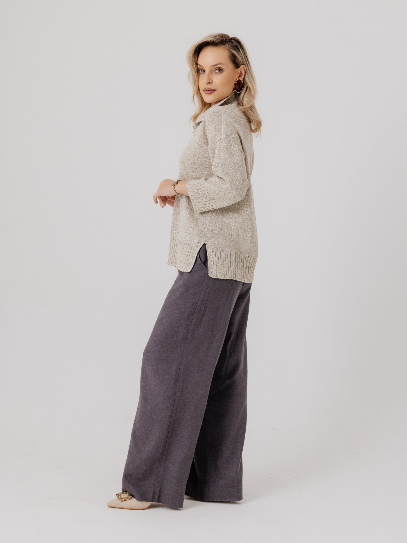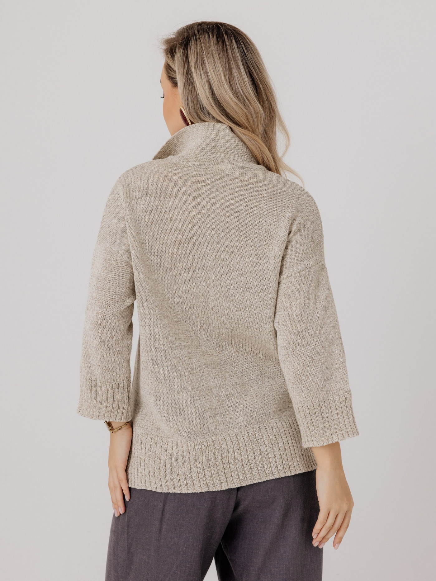 Широкий отложной воротник поло , который добавляет элегантности и делает образ более структурированным. Низ изделия и манжеты выполнены в виде плотной резинки, что обеспечивает аккуратную посадку и подчёркивает текстуру вязки.