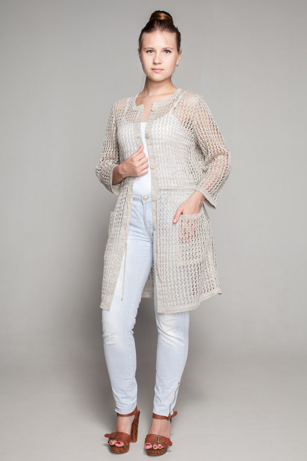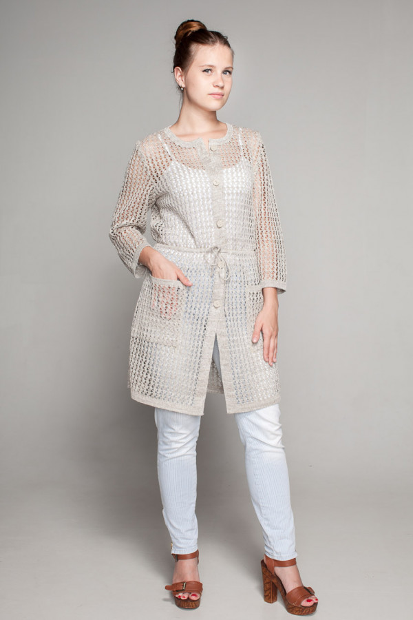Кардиган лен 100%, силуэт прямой, по талии фиксируется шнурок.