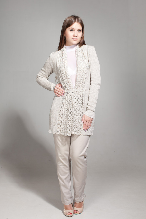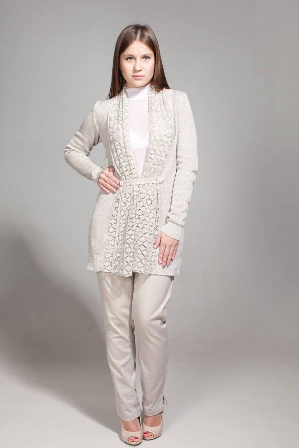Кардиган лен 100%, силуэт слегка приталенный, по переду двойной воротник в виде шалькиажурный, рукав длинный.