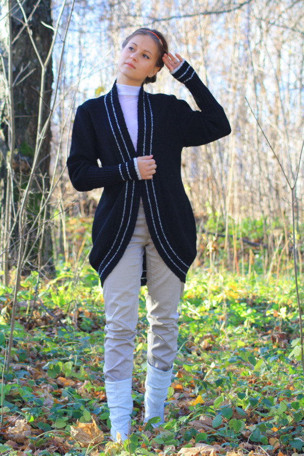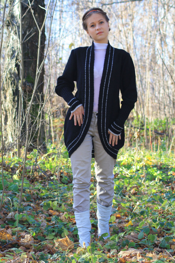 Кардиган лен 60%, п/ш 40%, силуэт приталенный, рукав втачной длинный, длина резинки на рукаве 23 см. по полочке отделочная широкая резинка.
