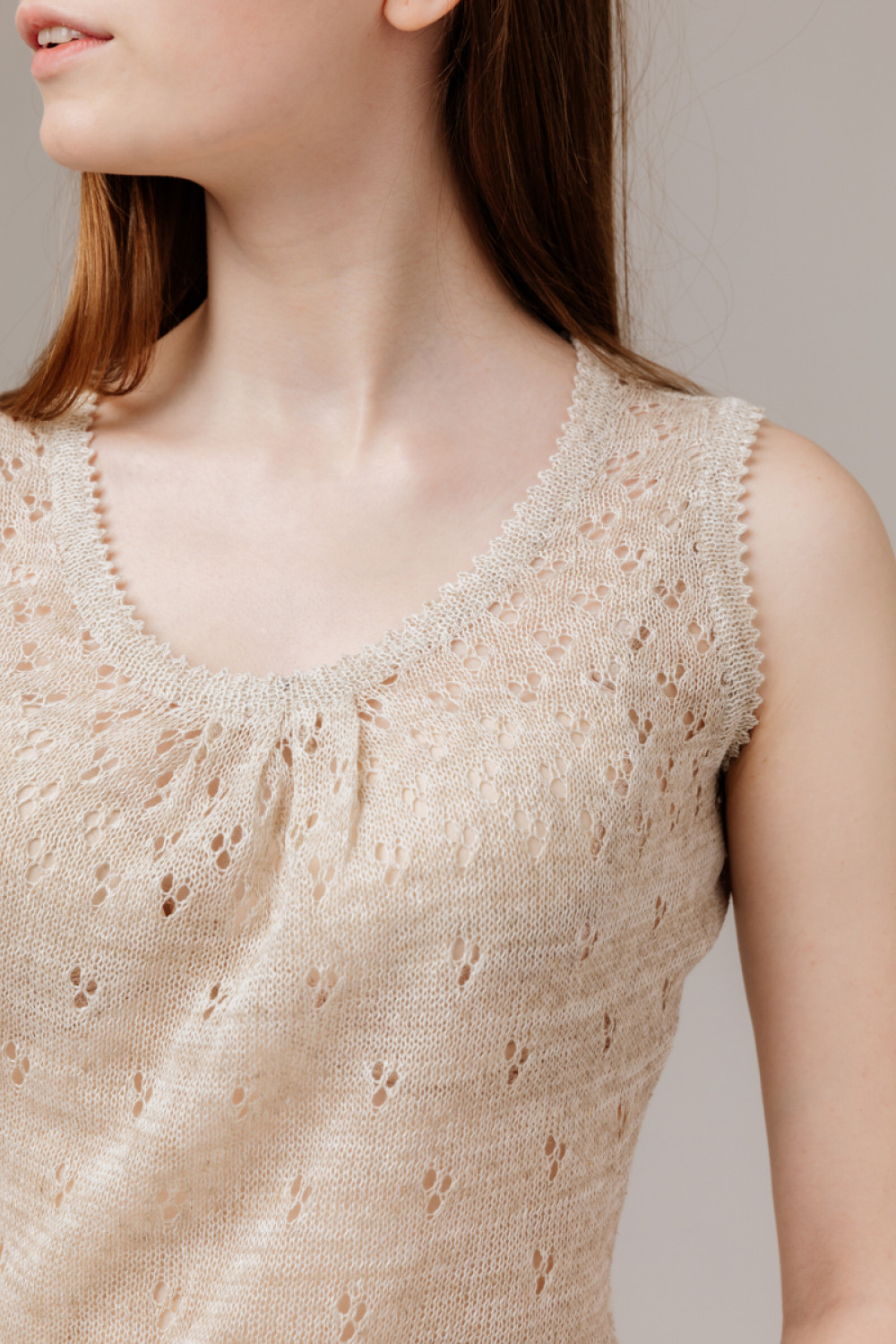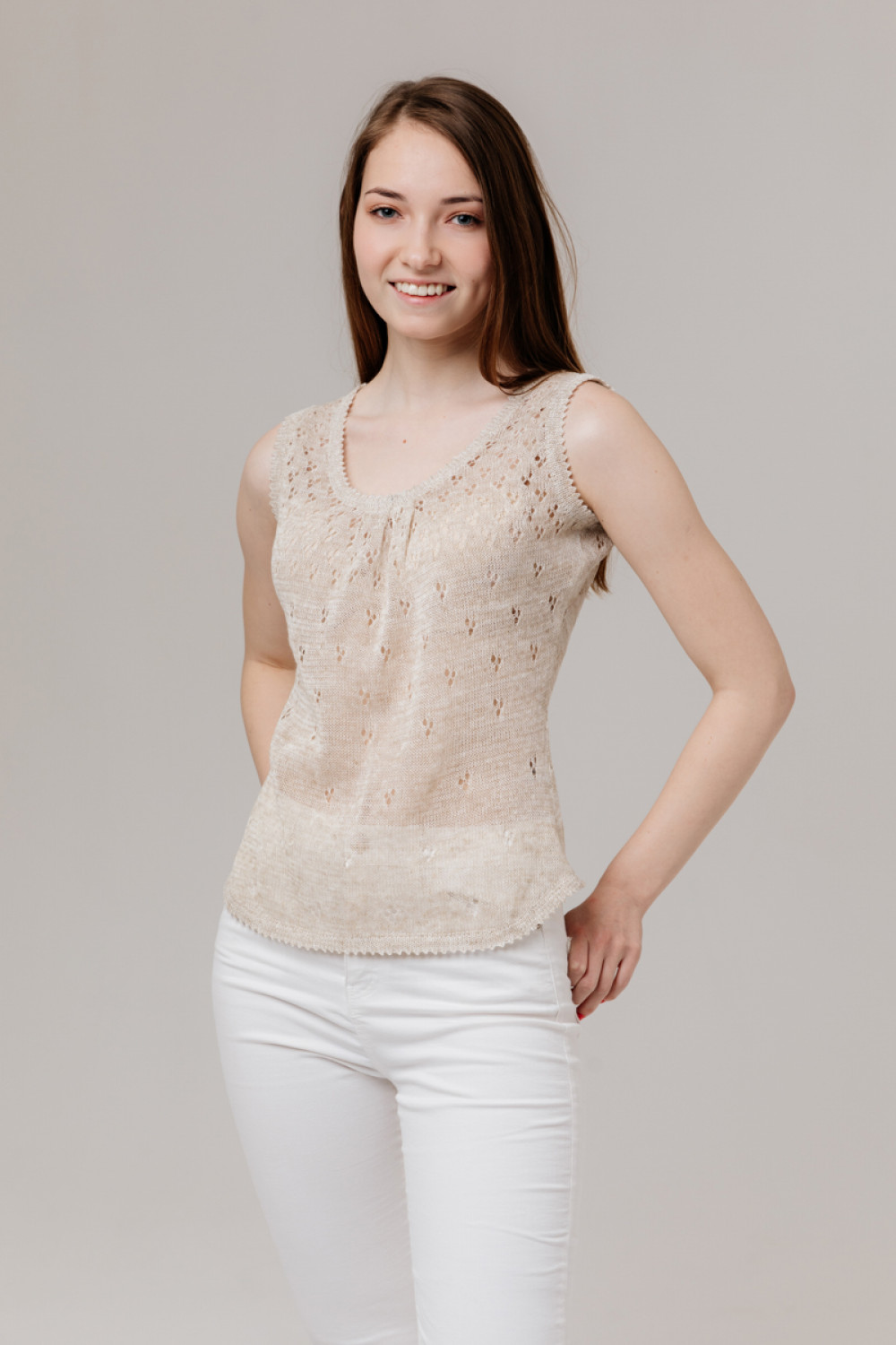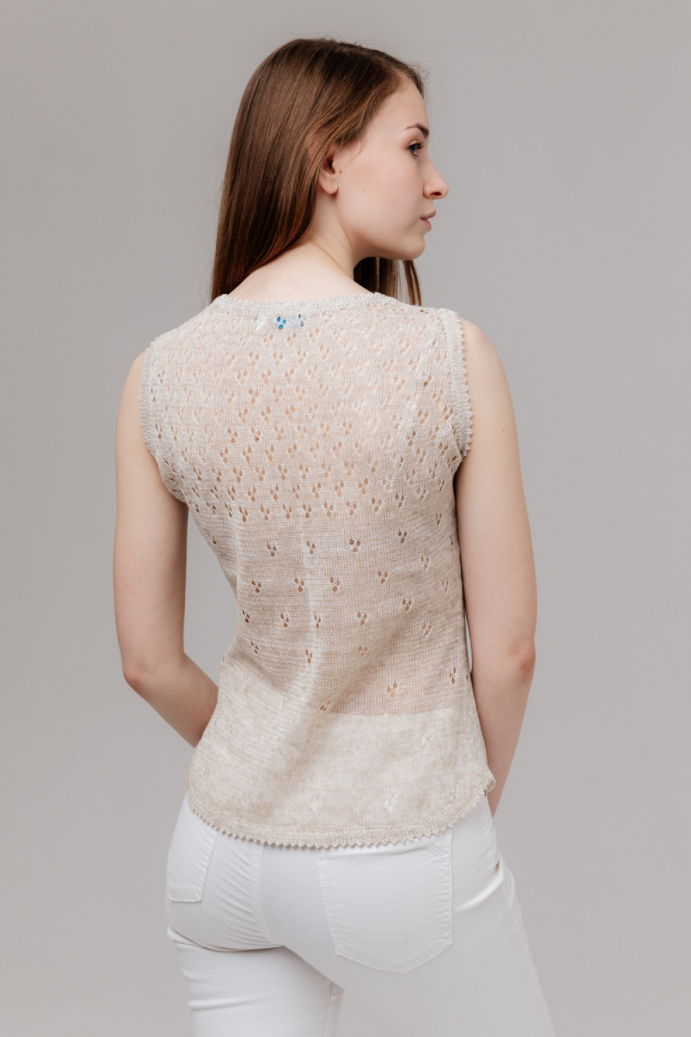 Топ лен 100%, силуэт приталенный, ажурный.