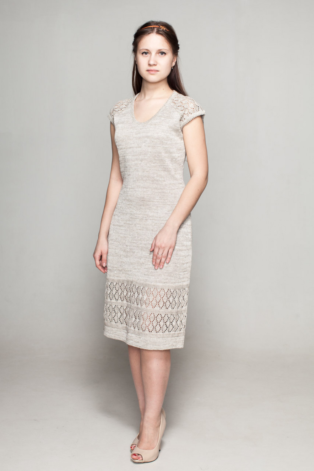 Силуэт приталенный, по низу ажурная полоса.