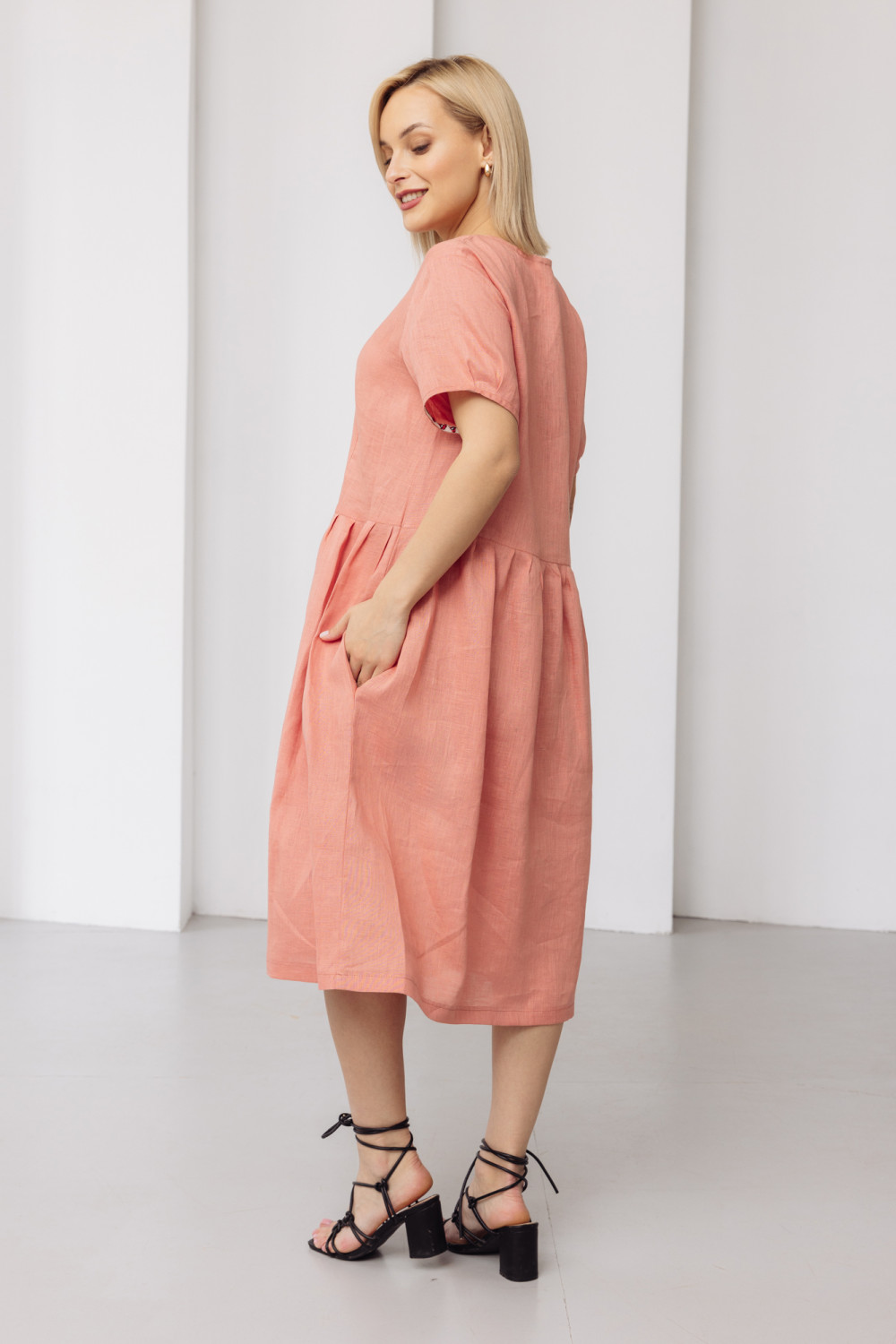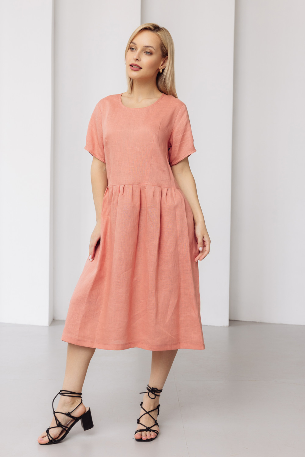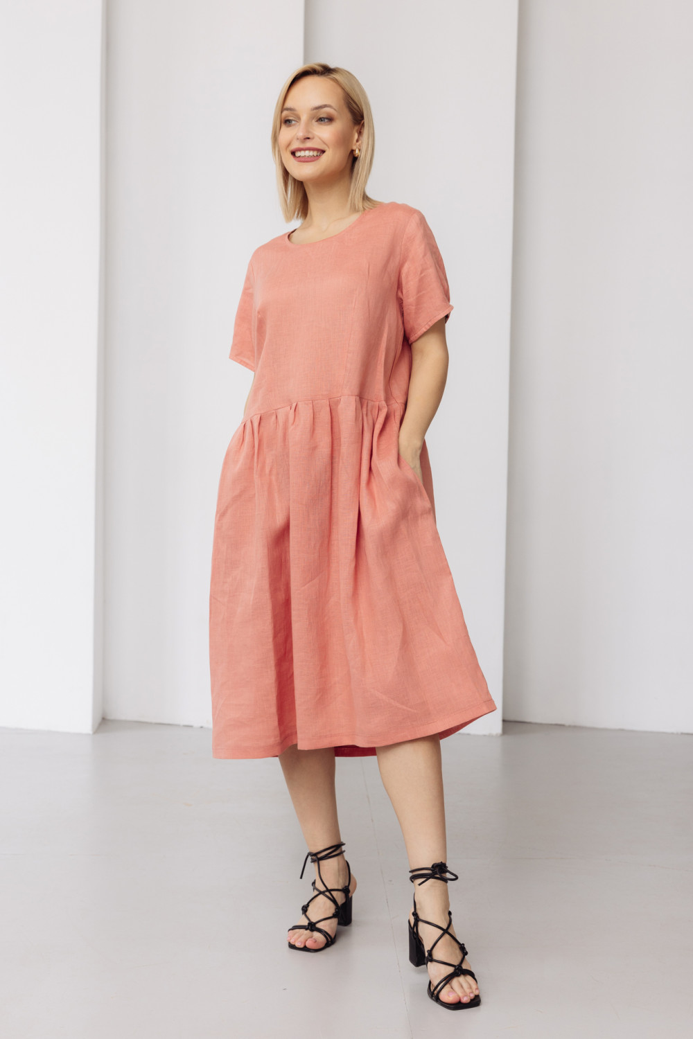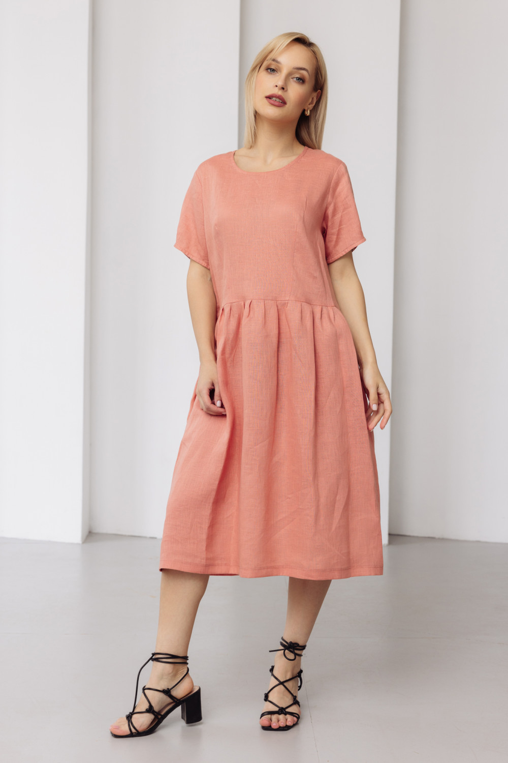 Платье из льняной ткани. Силуэт свободный.