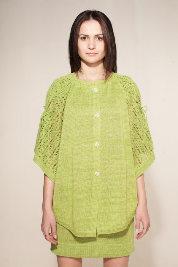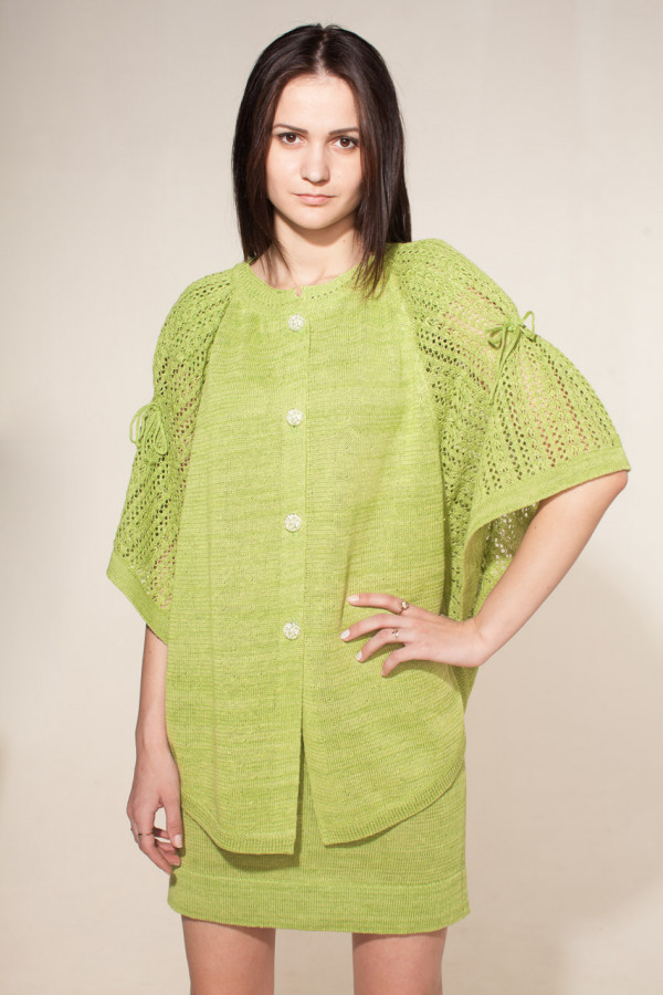Пончо 100% лен, горловина круглая, рукав ажурный. Застежка на 4 пуговиц.