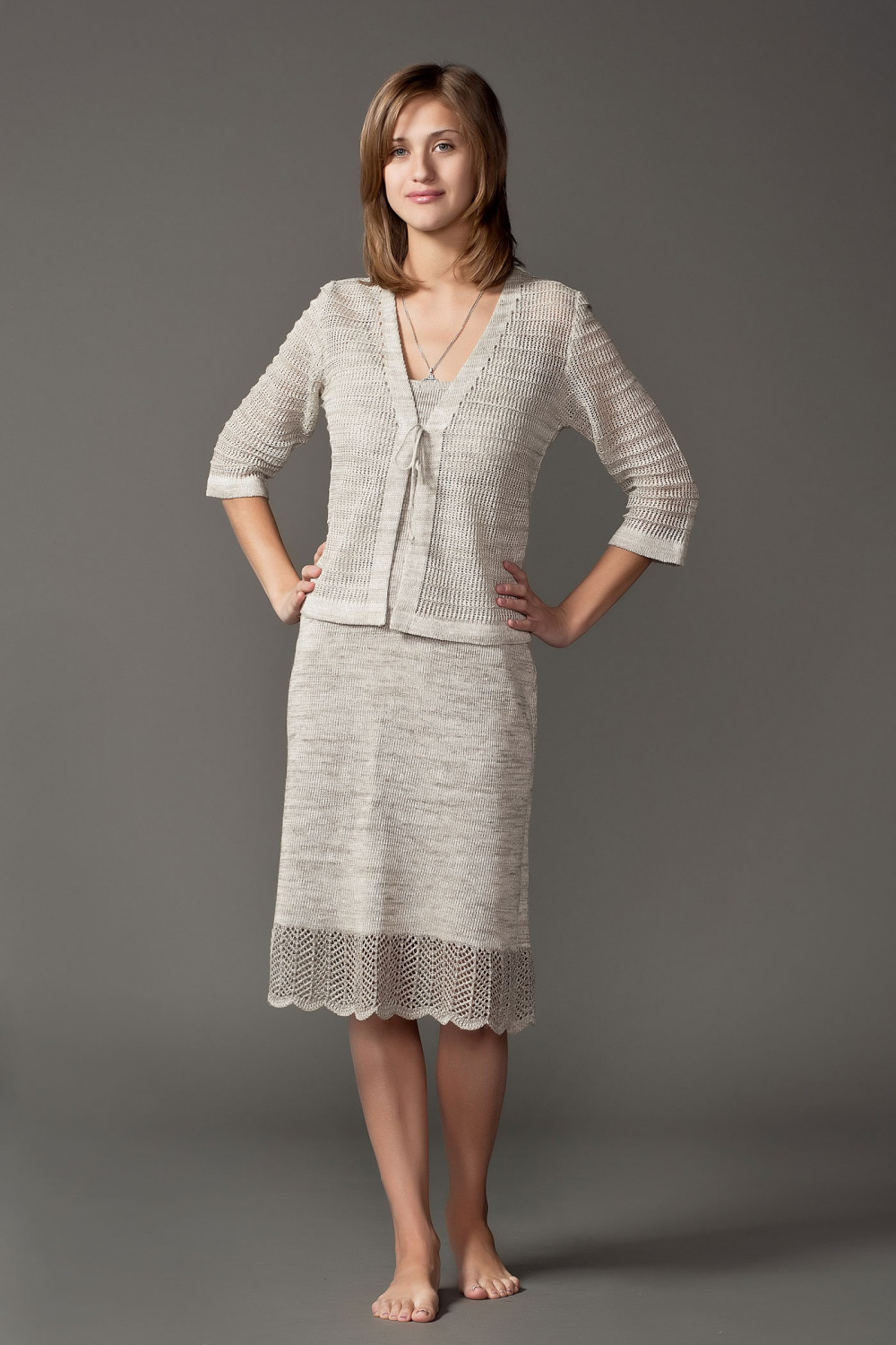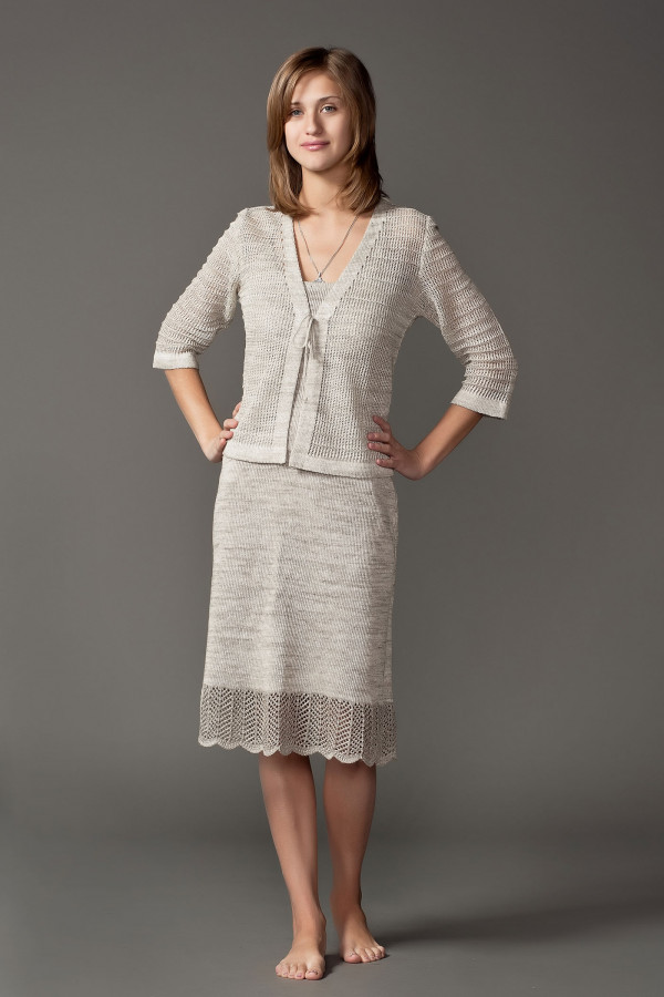 Сарафан из льна, силуэт приталенный. Снизу ажурная отделка.