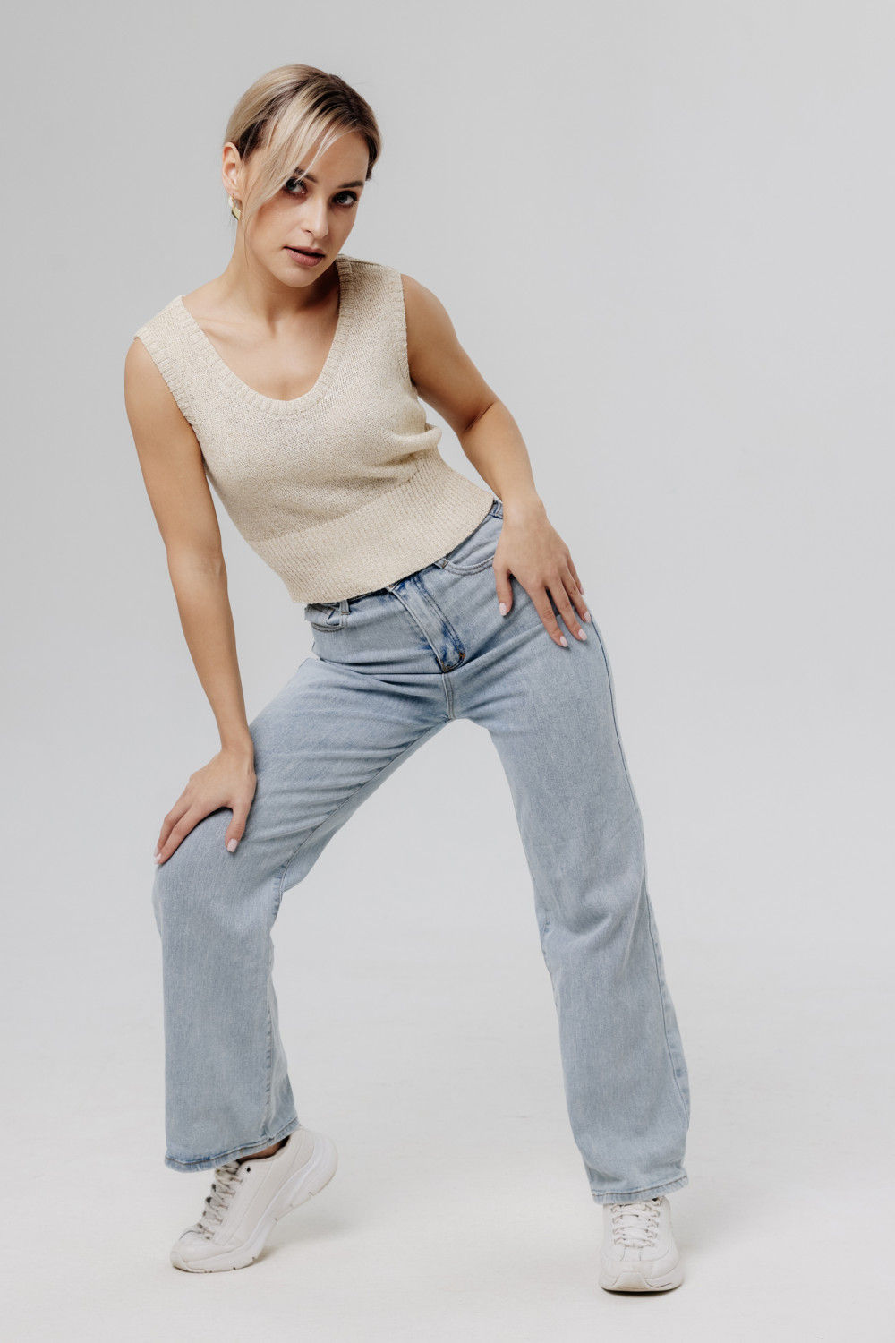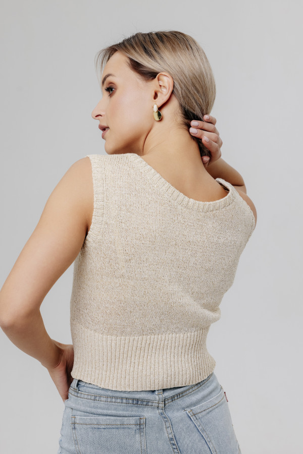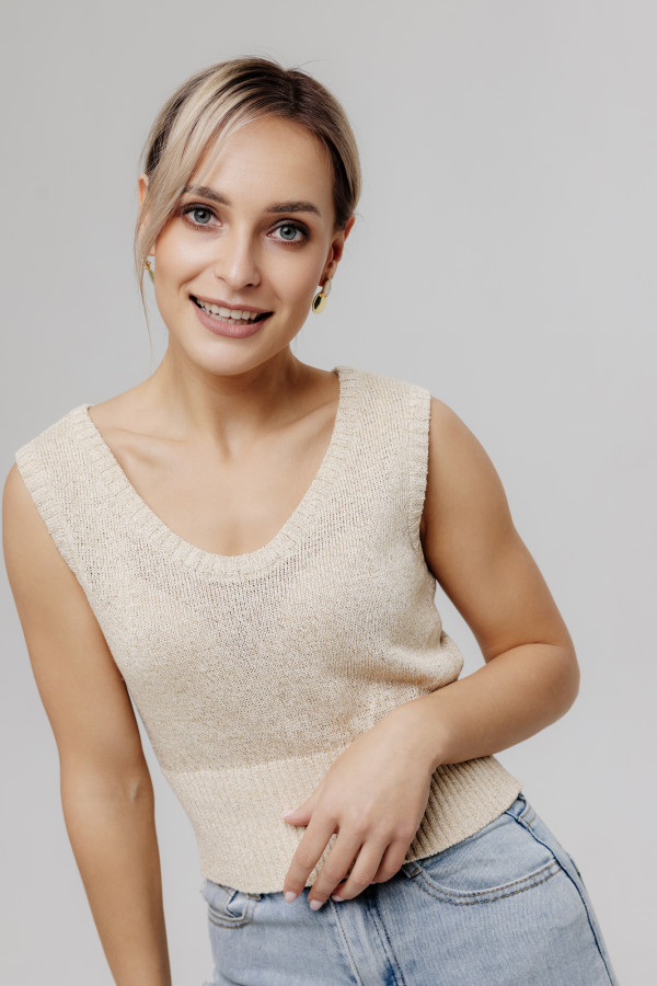 Топ укороченный 95% лен, 5% золотой люрекс, силуэт прямой.