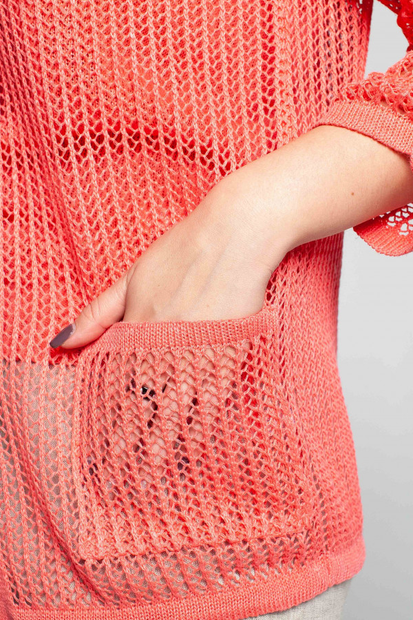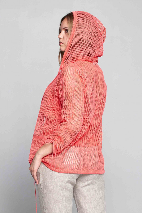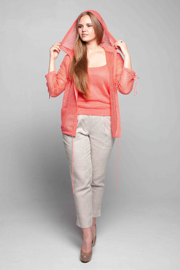Жакет изо льна ажурный, прямой силуэт, рукав втачной 3/4, по середине рукава затягивается шнуровка. Капюшон. По полочке два накладных кармана.