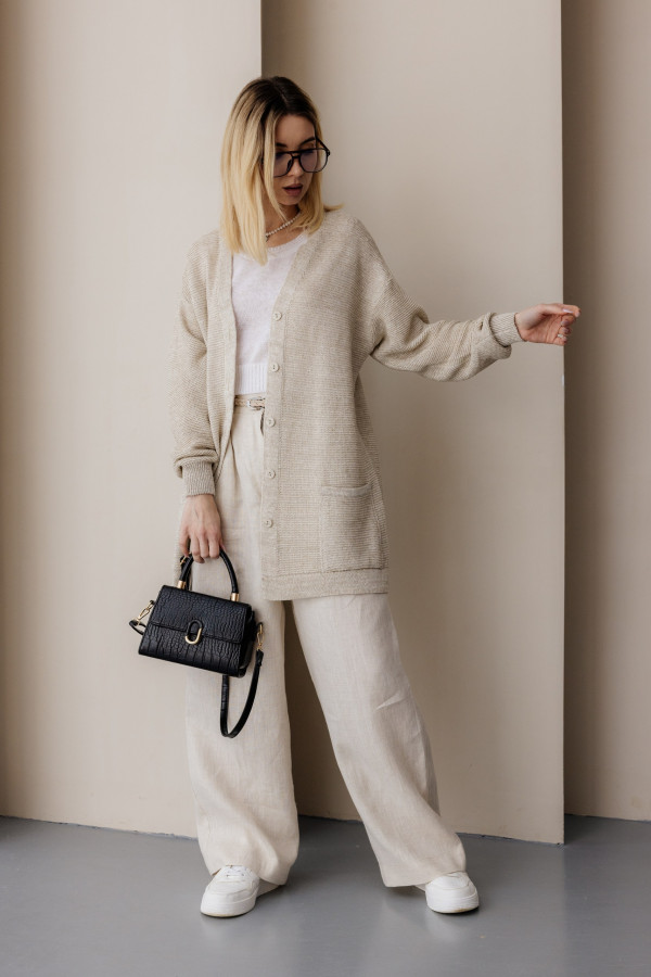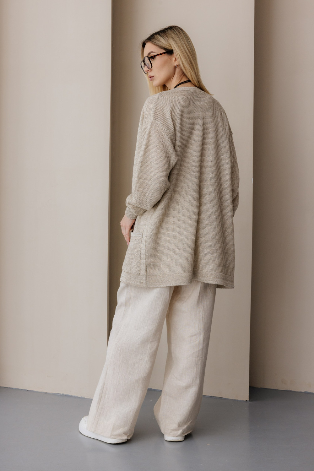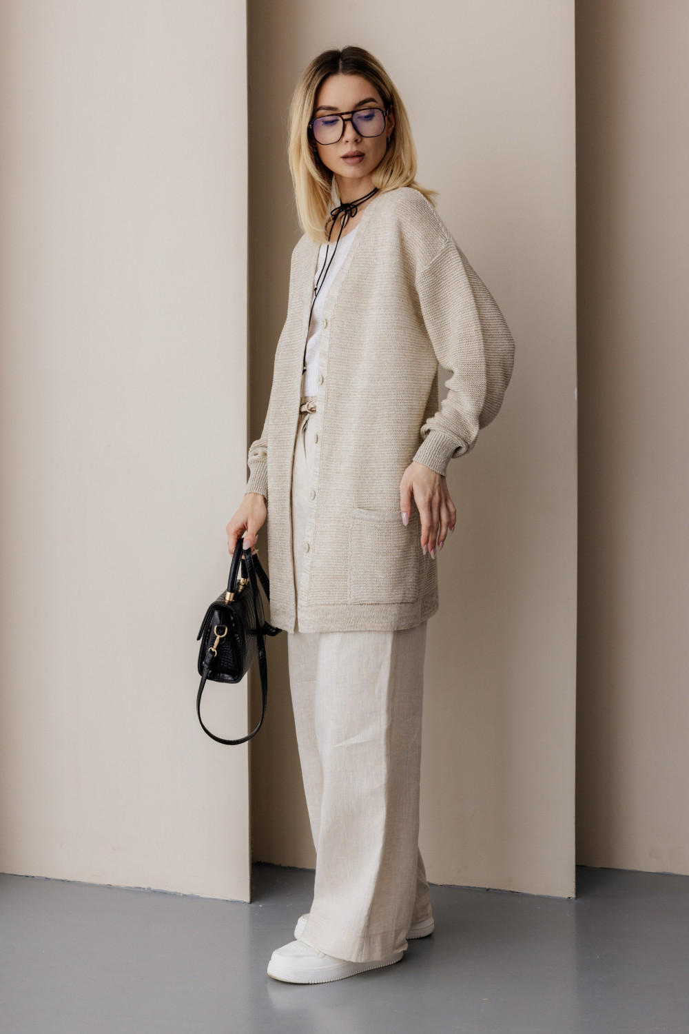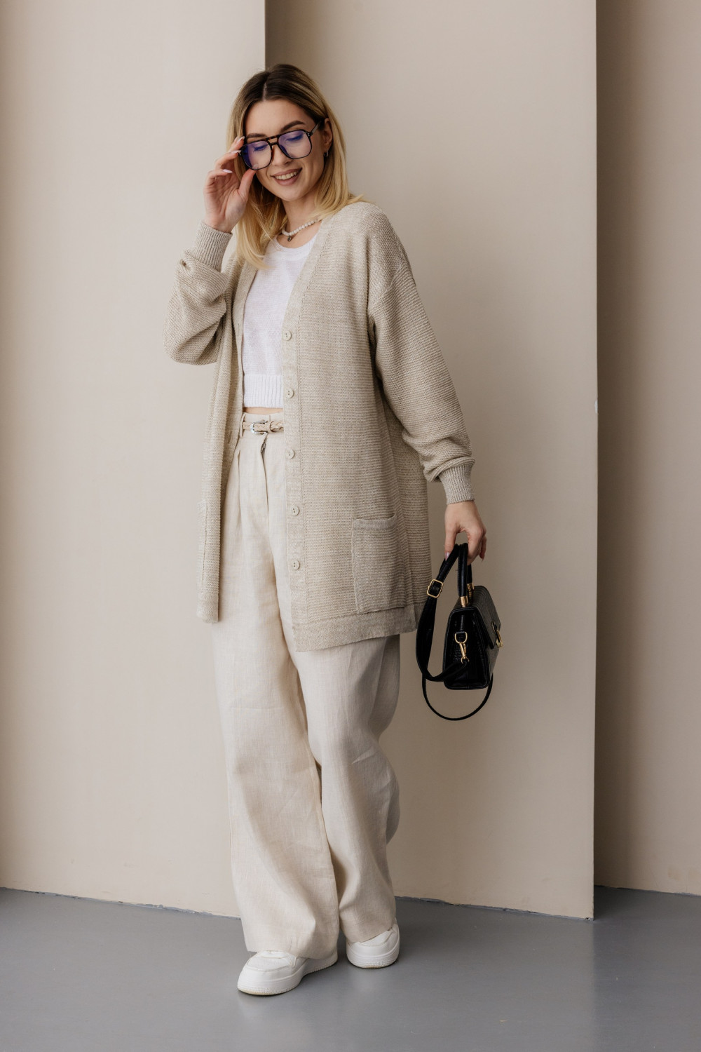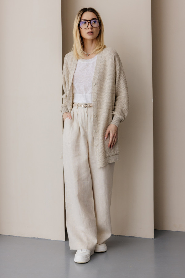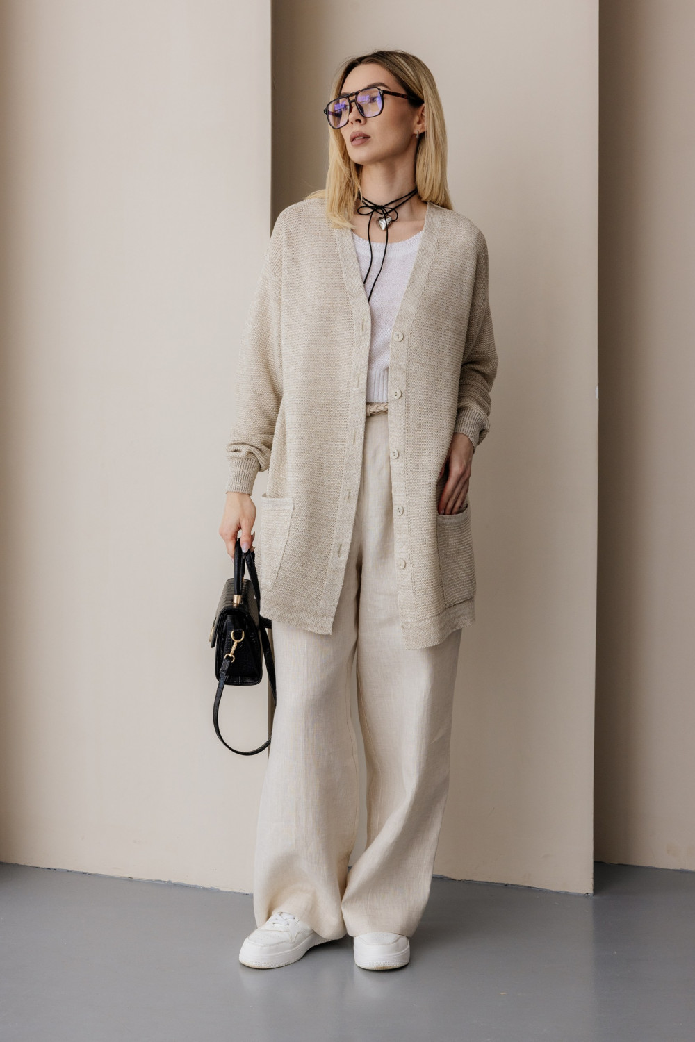 Стильный женский удлиненный жакет изо льна, силуэт прямой.