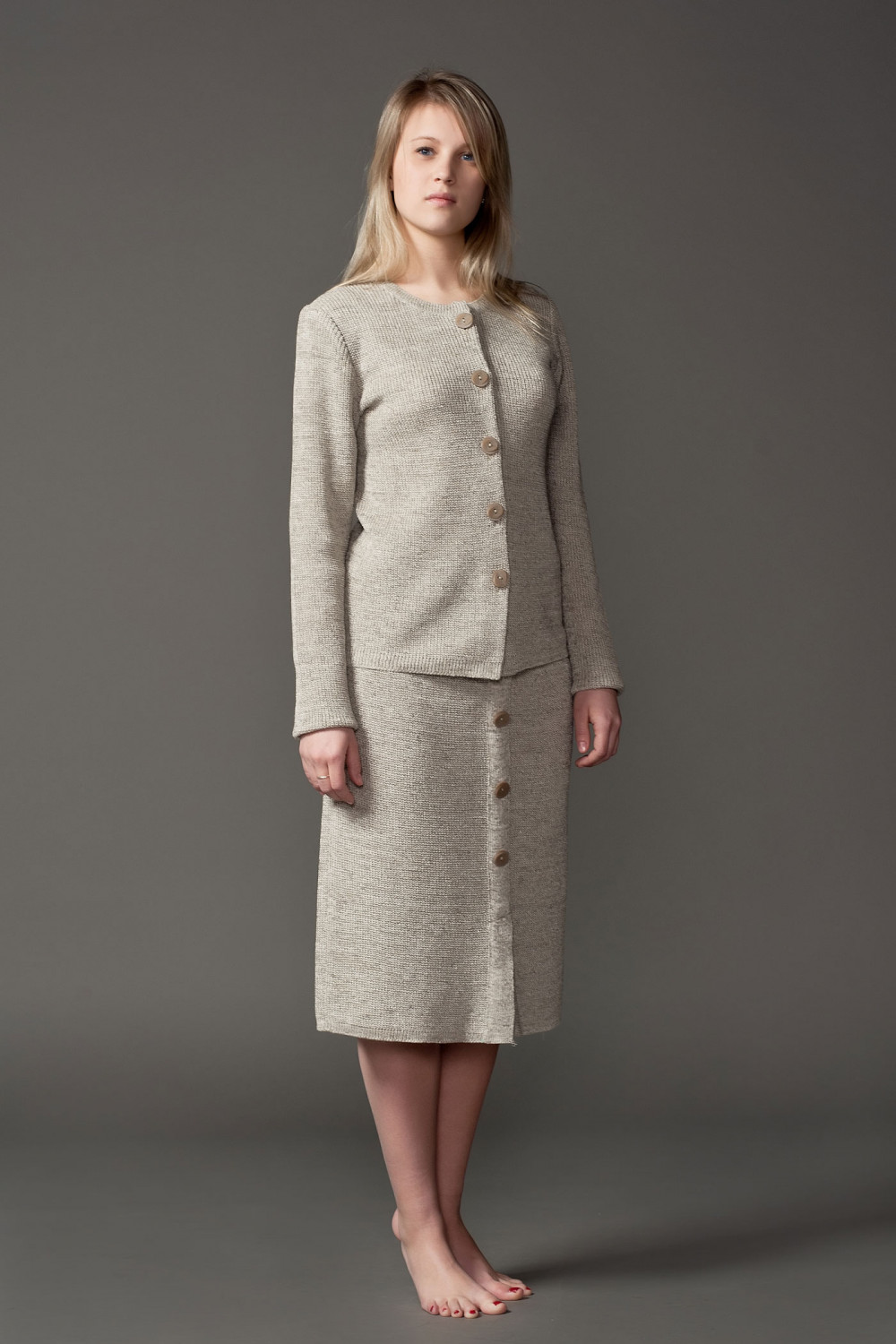 Жакет лен 100%, силуэт прямой, вязка полуфанг, рукав длинный, горловина круглая. Застежка на 5 пуговиц.