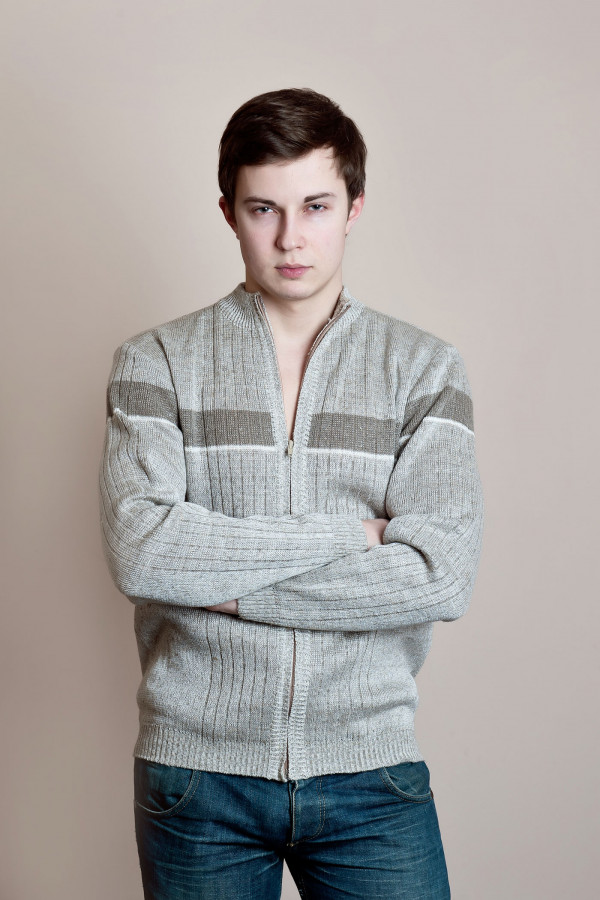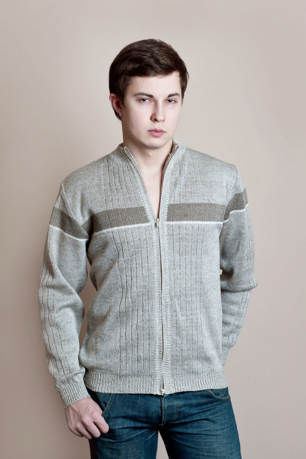 Жакет лен 100% муж. Воротник стойка, с низу и по рукавам резинка, застежка на молнии.