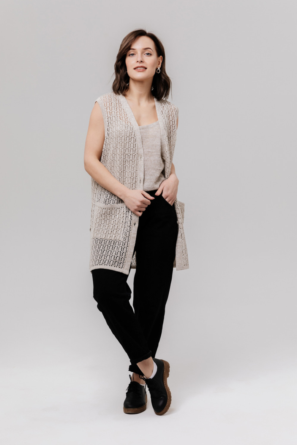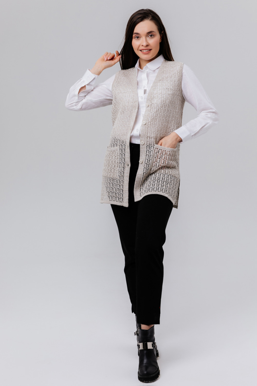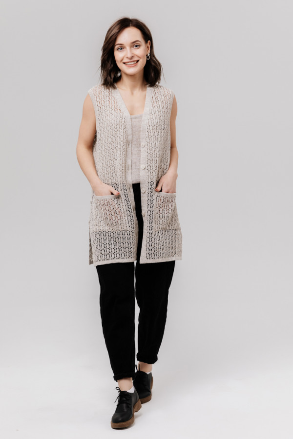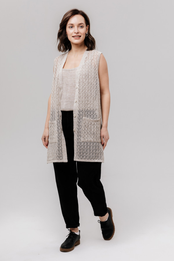 Жилет удлиненный из льна, силуэт прямой.