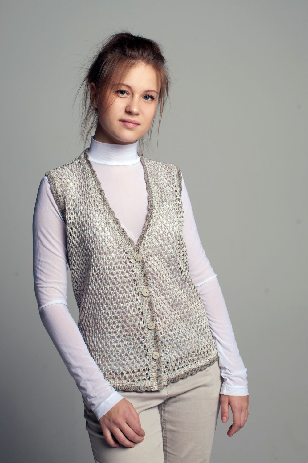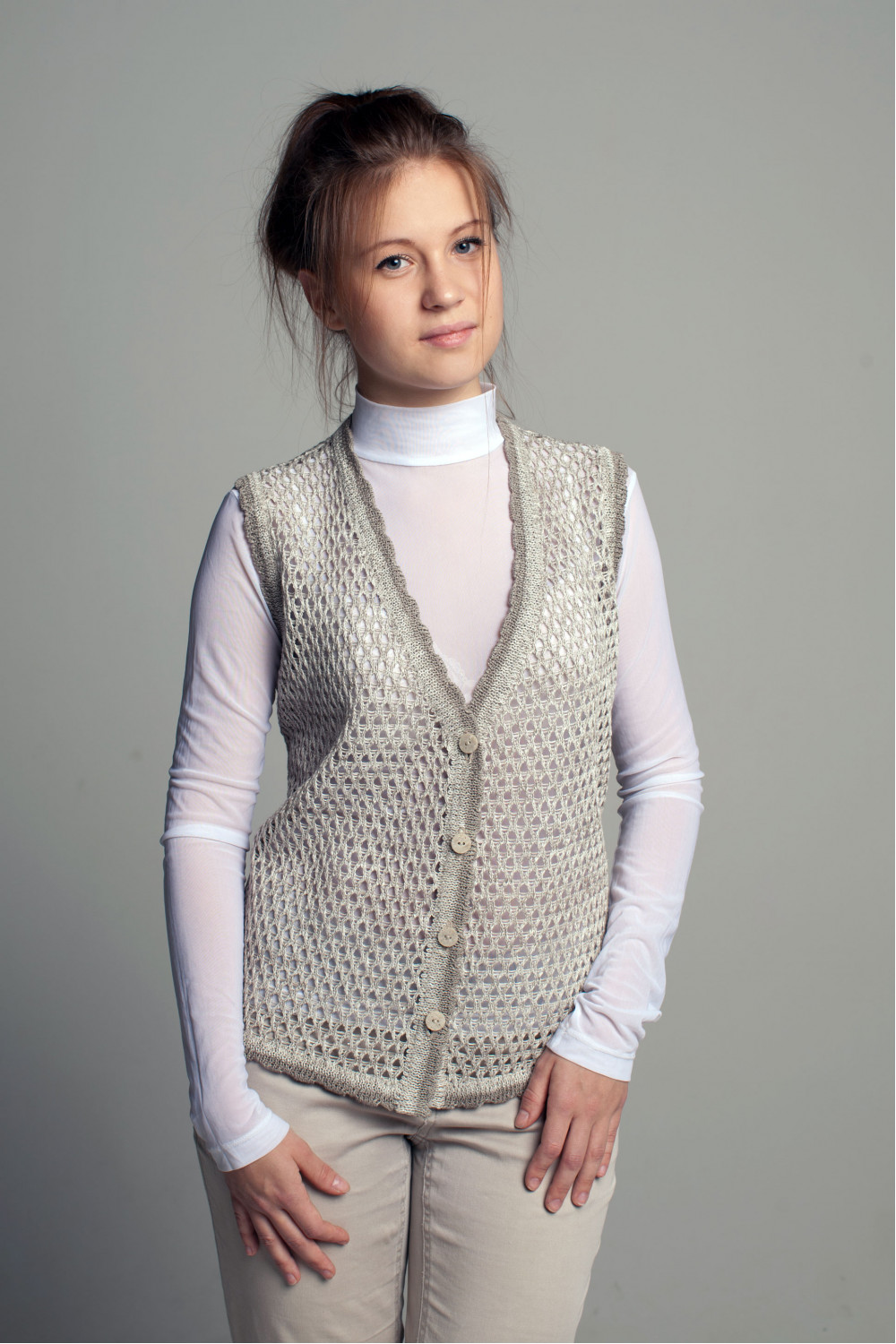 Жилет женский лен 100 %, укороченный, силуэт приталенный по спинке, ажур сетка.