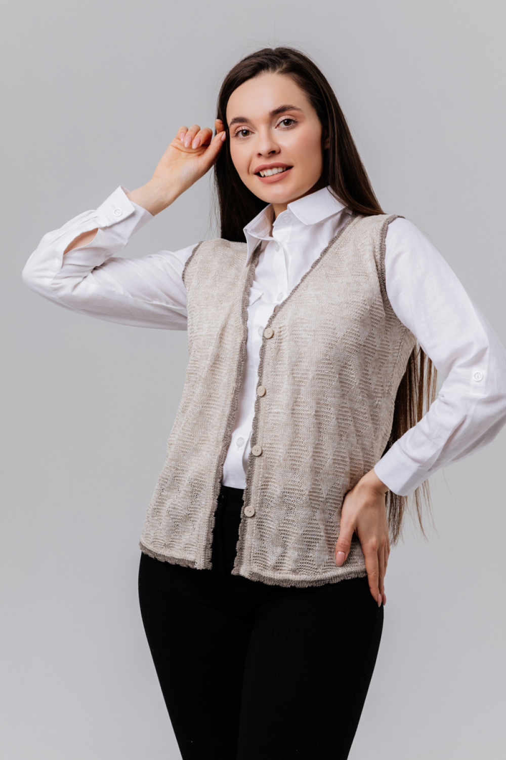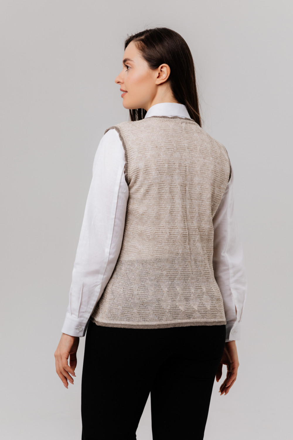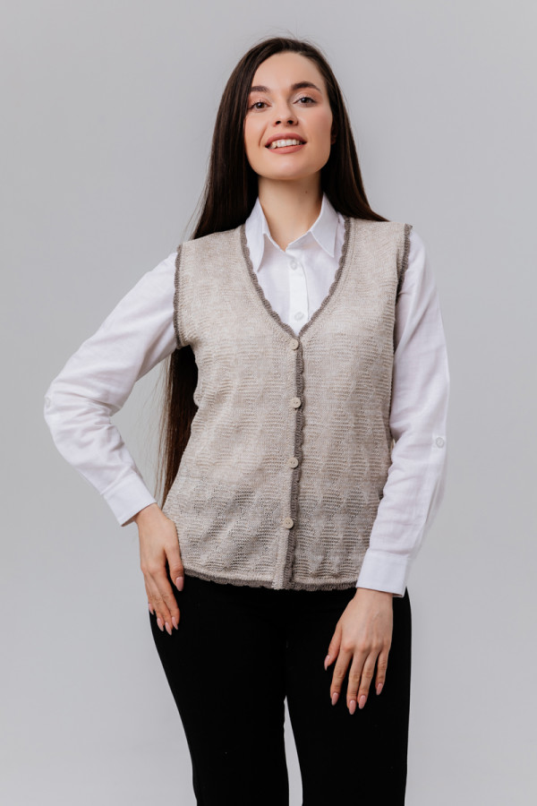 Жилет женский лен 100 %, укороченный, силуэт приталенный по спинке.