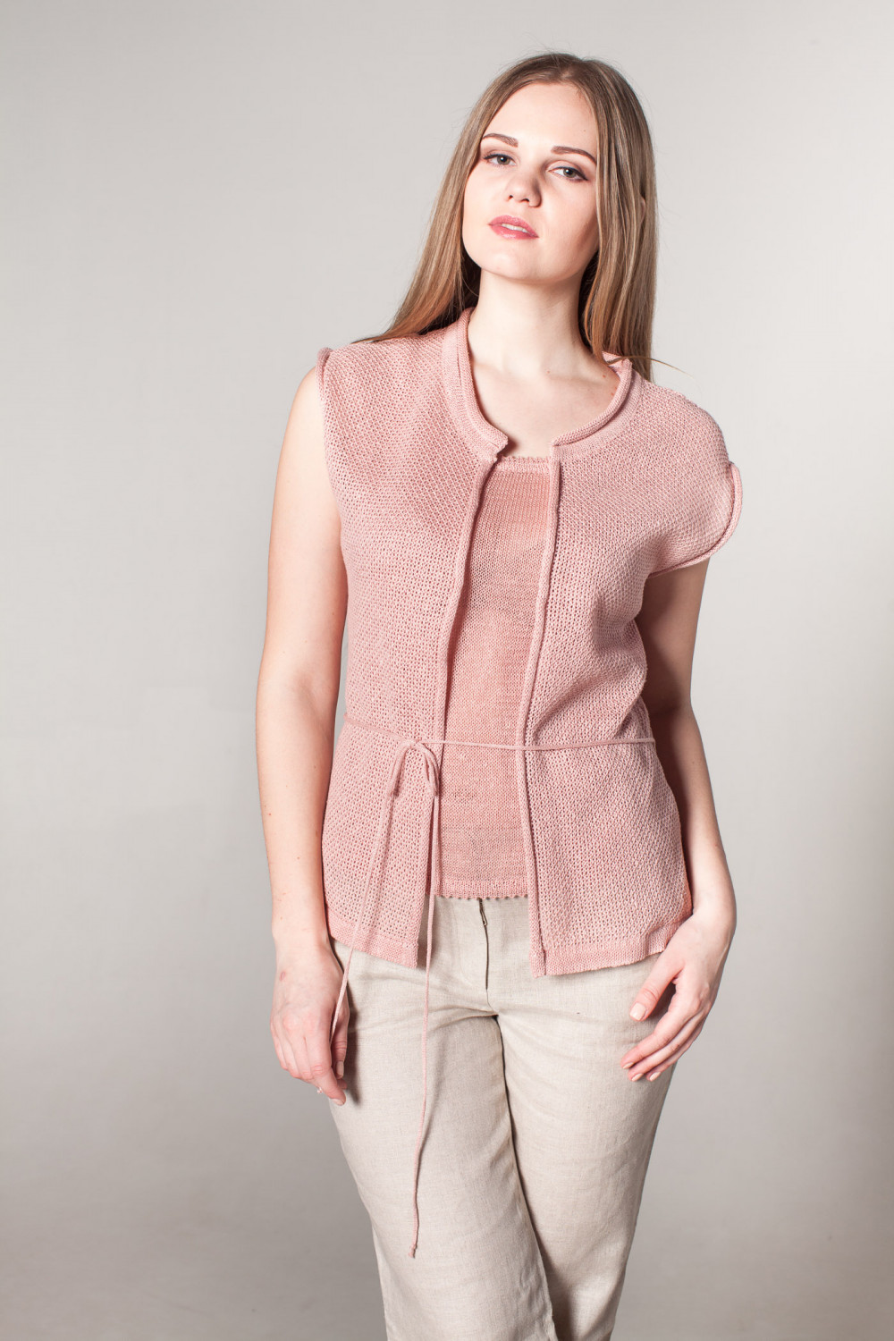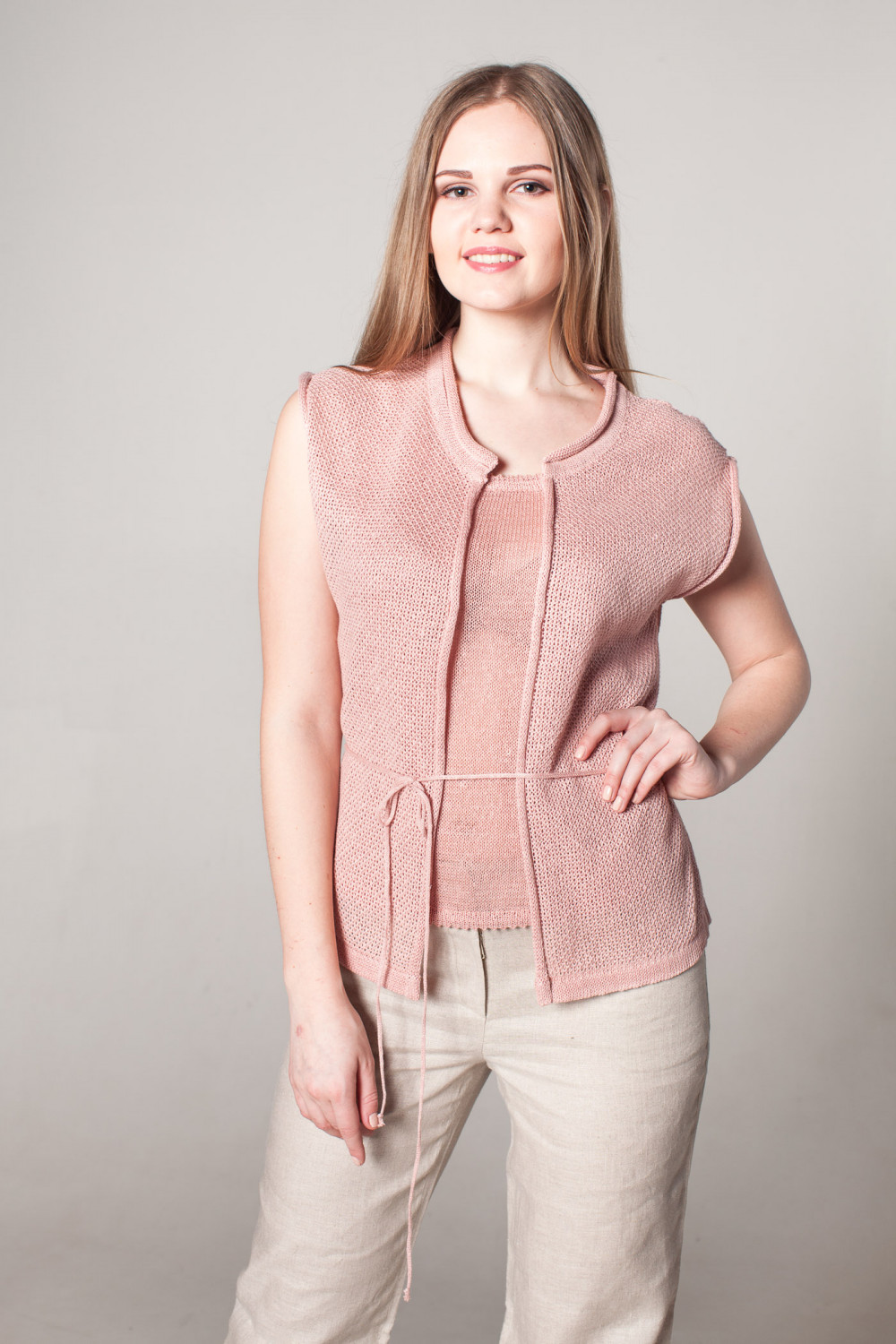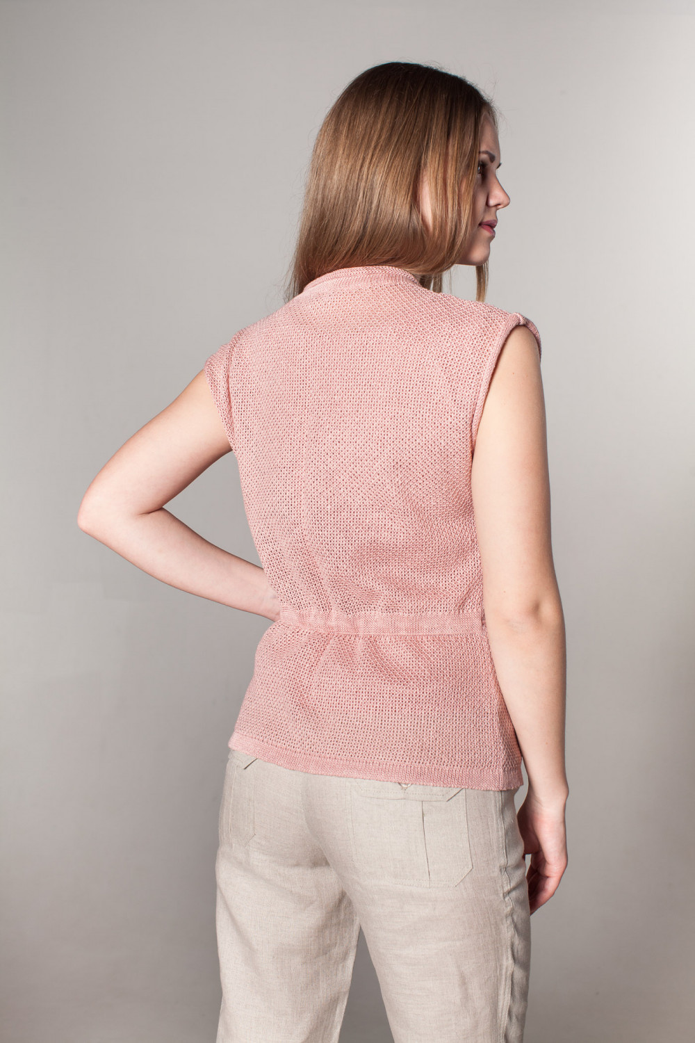 Жилет женский лен 100 %, силуэт прямой. На спинке по линии талии в кулиске вставлен декоративный шнурок. Плечо приспущенно.