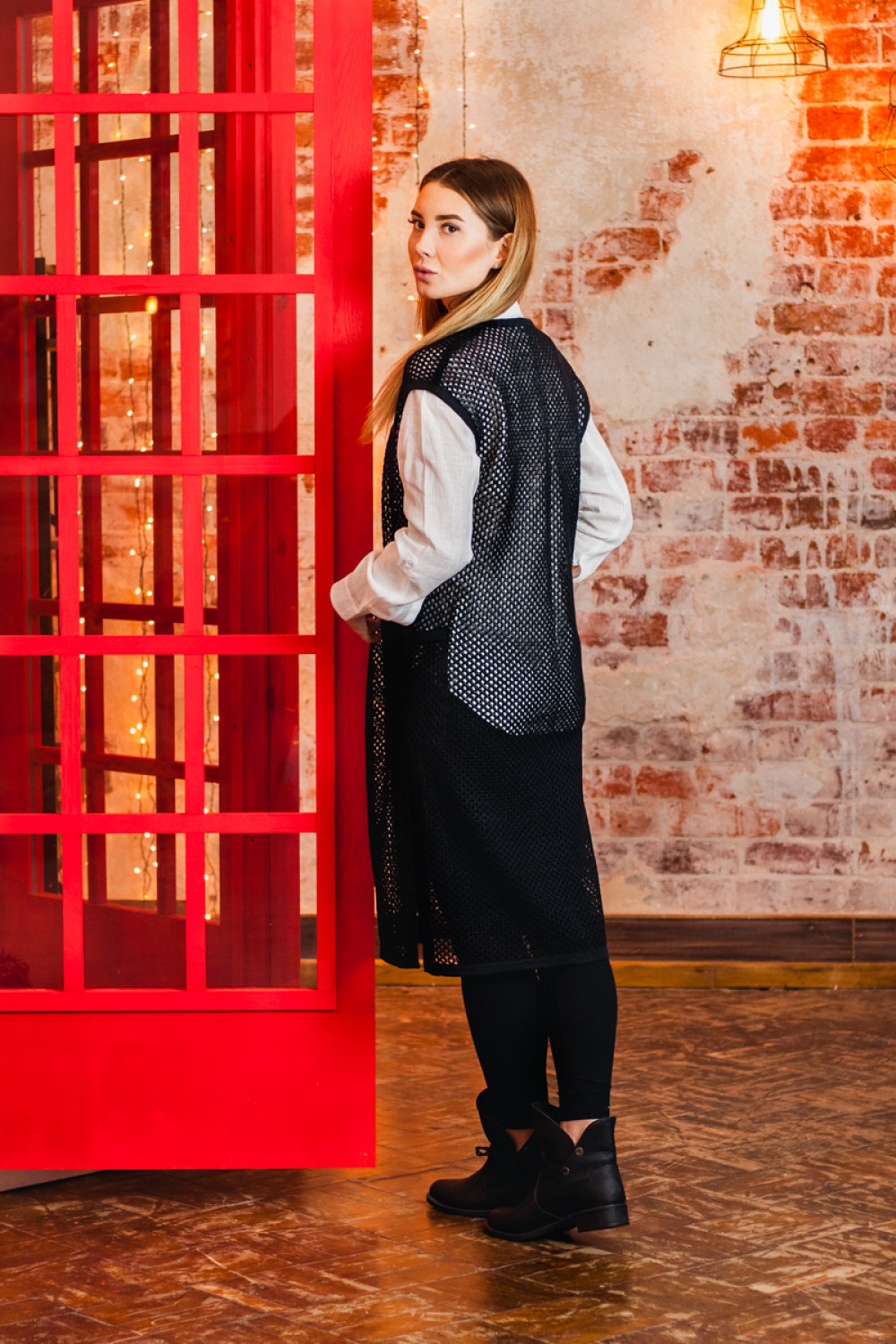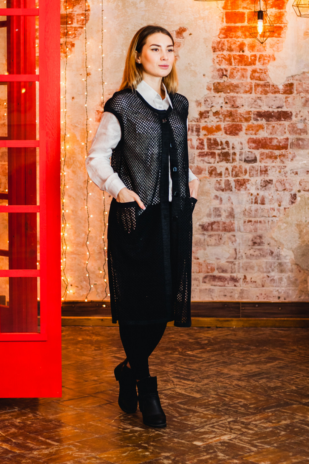 Жилет удлиненный из льна, силуэт прямой.