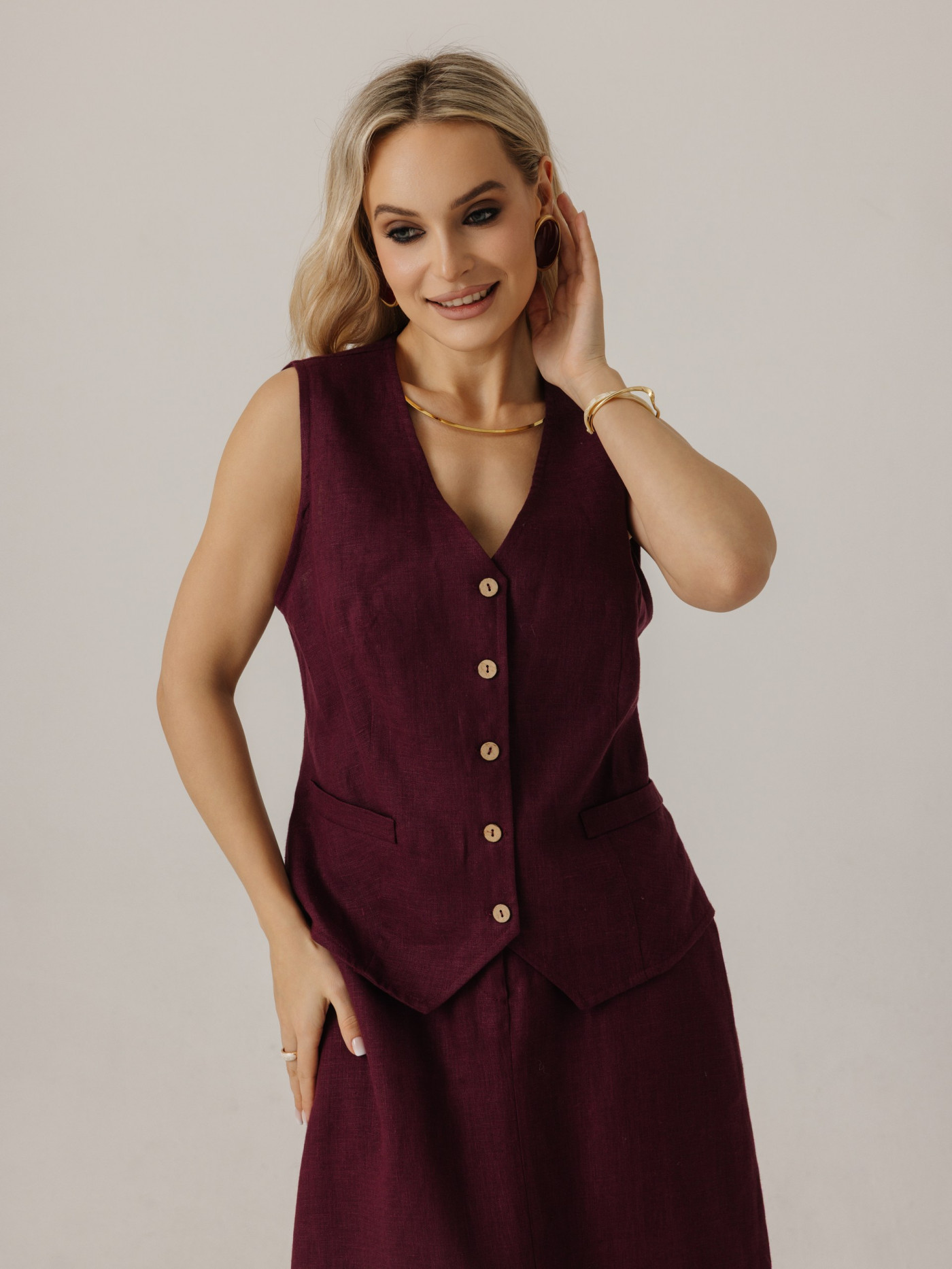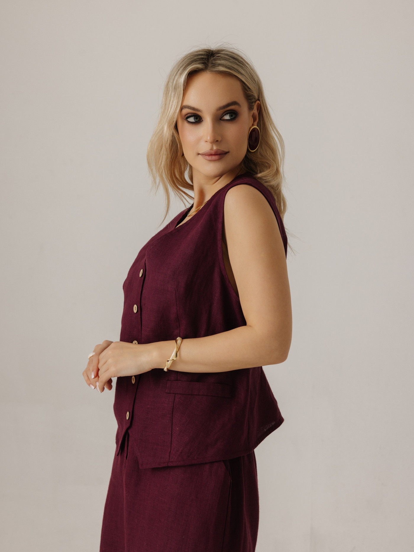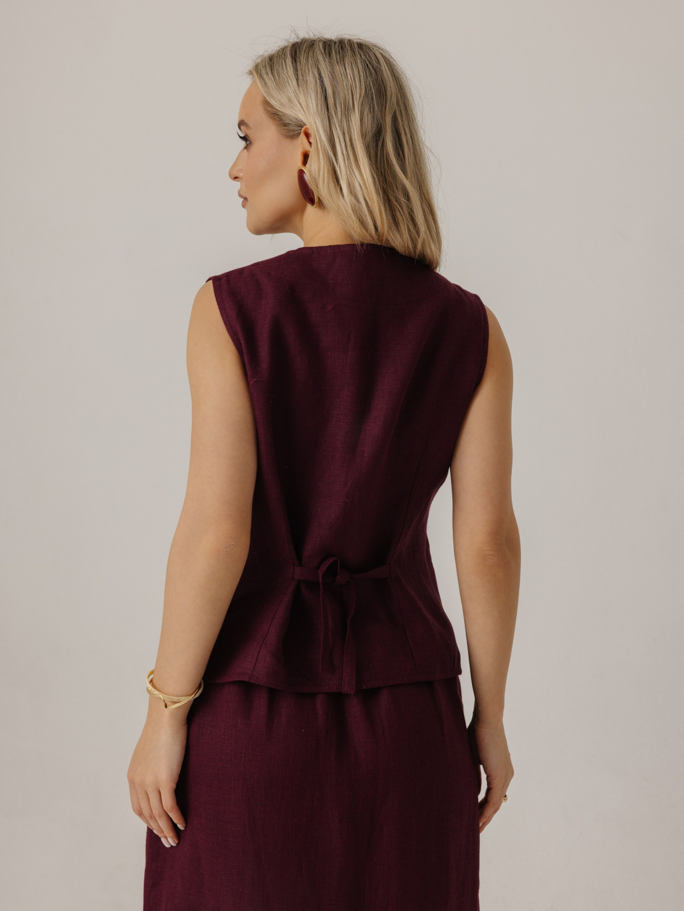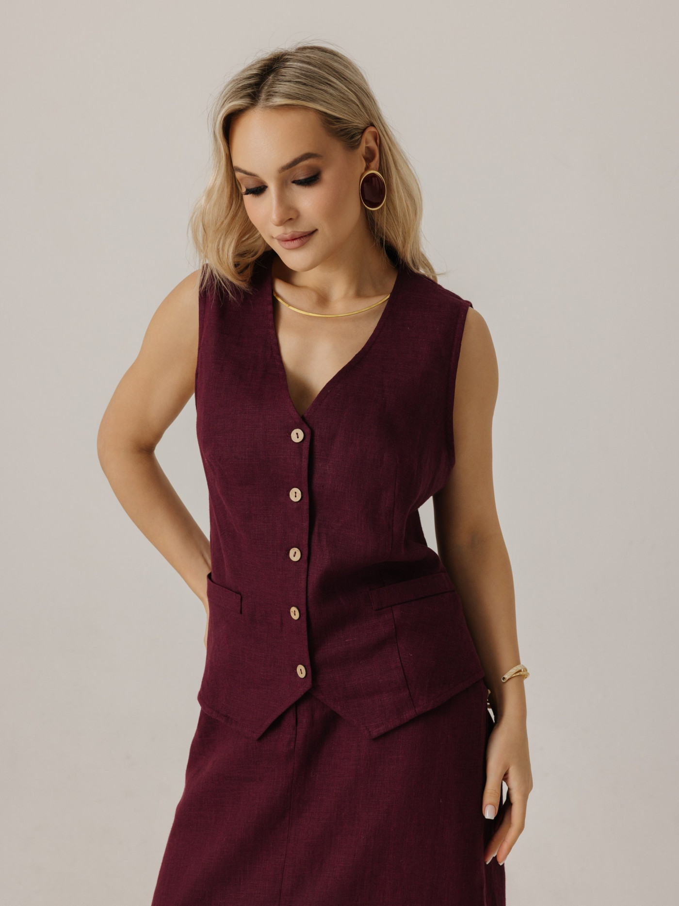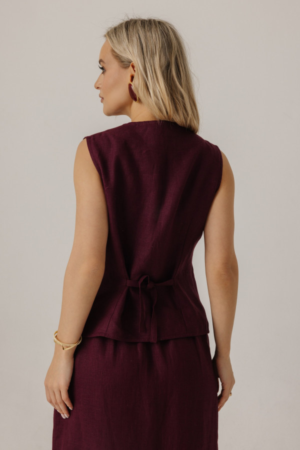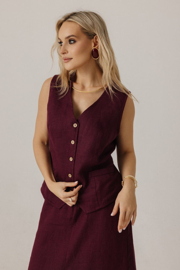 Жилет удлиненный из льна, силуэт прямой.