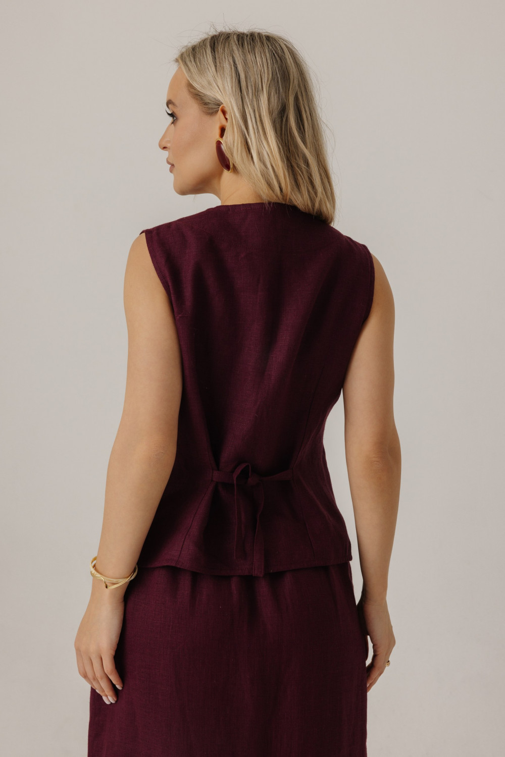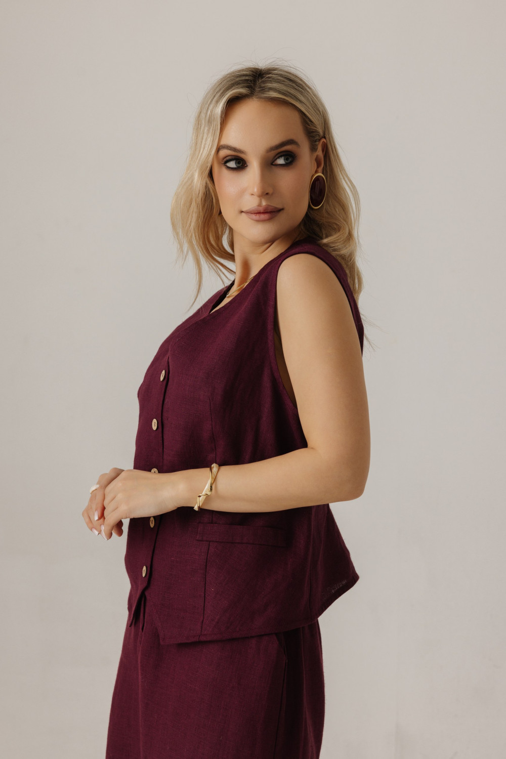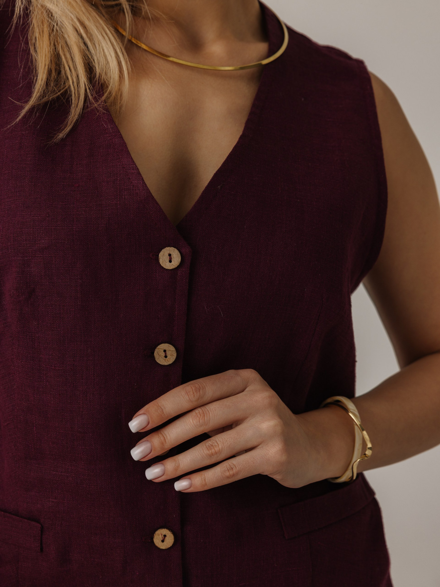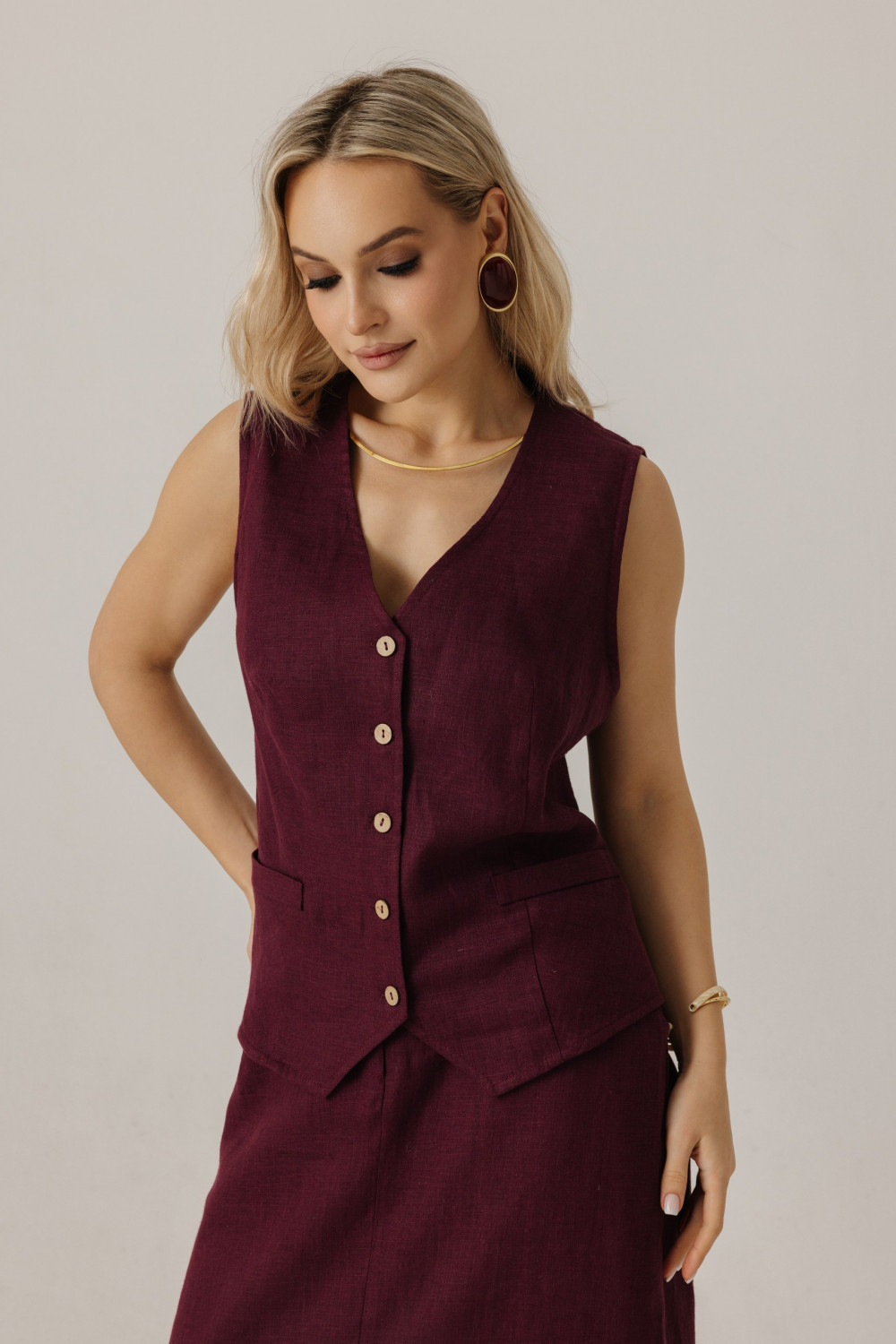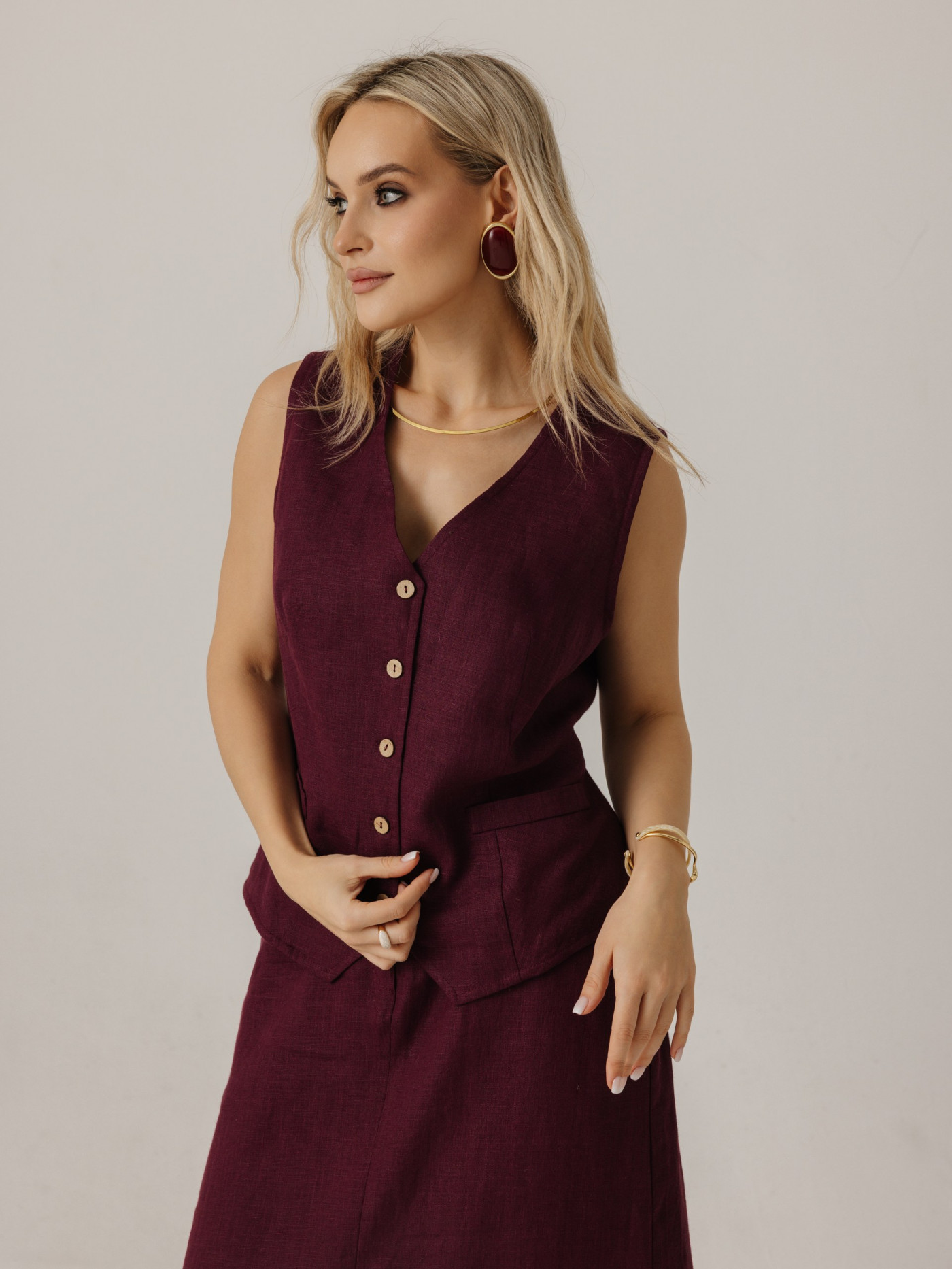 Жилет удлиненный из льна, силуэт прямой.